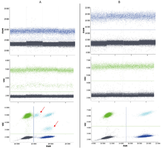 作者首先对所有引物进行单靶反应测试,并用相应的探针检测扩增子。然后优化了多重检测技术。一些引物被排除在外。引物对被排除的原因有四个:(1)没有扩增目标,(2)扩增的产物量比用其他引物对扩增的产物量高,(3)两个探针检测到了相同的扩增子,(4)用引物对扩增成功,但提高了第二个通道中阴性液滴的荧光(图A)。优化后(图B),选择最终的多重扩增,从每条染色体各扩增16个扩增子。多重ddPCR导至对照个体基因组DNA的比值为Chr 21/Chr 18 = 0.9715,T21个体的基因组DNA的比值为1.4555,从而正确地反映了核型中Chr 21的数量。