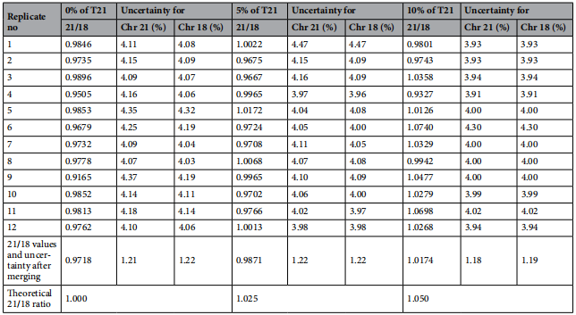 作者用人类女性基因组DNA和人类T21基因组DNA制备了含有20%、15%、10%、5%和0% T21基因组DNA的0.125 ng/µl DNA人工样本混合物。对于每种混合物,在12个重复中进行ddPCR检测,对所有12个重复获得的数据进行合并,并计算不确定性(下表)。在本实验中,如果母体血浆中存在超过5%的胎儿cfDNA,则获得的不确定性似乎足以明确区分T21妊娠。