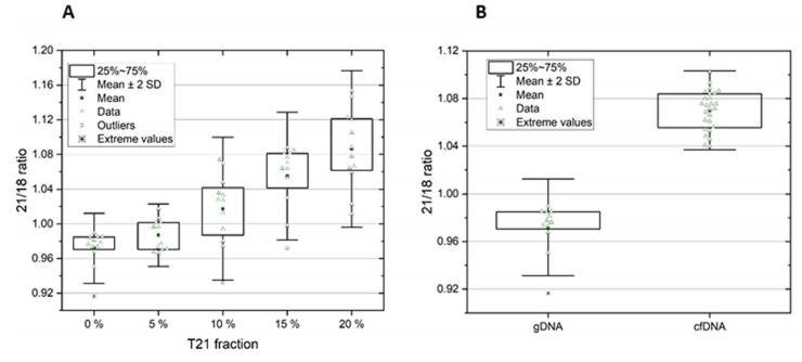 母体血浆是分析所需的cfDNA的真正来源。为了观察差异,作者将整倍体胎儿孕妇样本中获得的Chr 21/Chr 18比率与基因组对照DNA(人工样本)中获得的比率进行了比较(下图)。结果表明,通过检测真实血浆样本获得了更高的Chr 21/Chr 18比率。