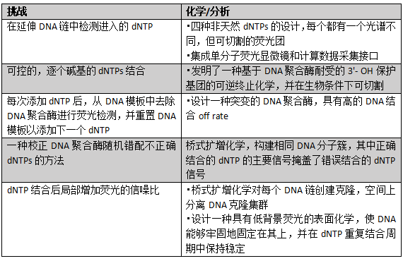 要使NGS这种测序方法成功,需要解决几个挑战。包括在脱氧核糖的3'-OH上确定一个适当的保护基团,使核苷酸一次一个地结合,在四个核苷酸上分别连上荧光团,同时使其不会破坏核酸合成;设计一种能容忍这些修饰的聚合酶,使荧光检测和切割终止基团成为可能;发展适当的表面化学以结合DNA链,并最终发明一种系统来规避低荧光信噪比并纠正由于聚合酶错误结合dNTP而导至的潜在错误。
