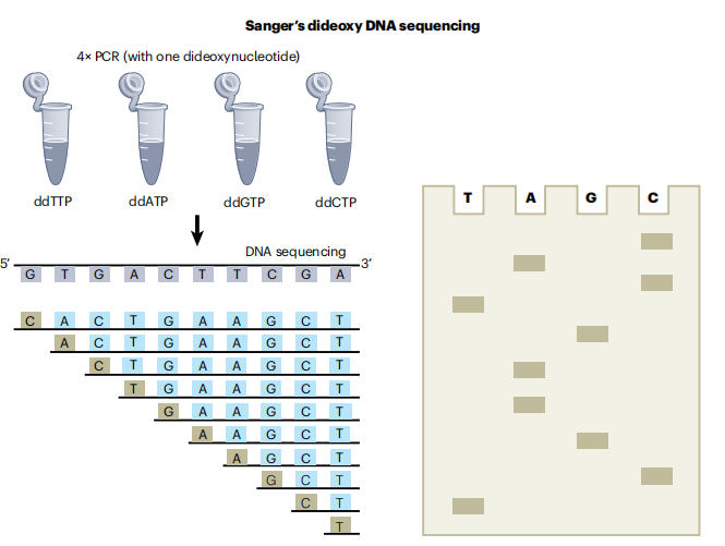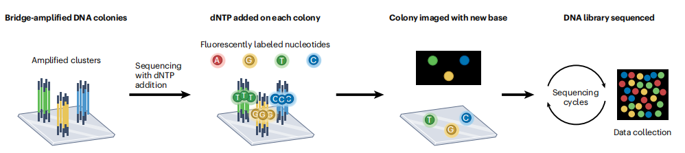 使用边合成边测序技术(SBS),新一代测序(NGS)第一个完全测序的大基因组是噬菌体。有了NGS,一个人类基因组的测序现在可以在2天内以200美元的价格完成。NGS中的SBS是由“可逆末端终止”作为核心技术。Sanger测序是基于从DNA模板中合成截断的DNA片段。这些截断是由于标记双脱氧核苷酸三磷酸(ddNTPs)的随机掺入导至伸长链过早终止。这是“终止化学”的最早形式,其中截断的合成DNA链通过凝胶电泳进行大小分离,然后重建原始DNA序列(下图)。电泳测序和类似的基于大小的核酸片段分离既耗时又费力。