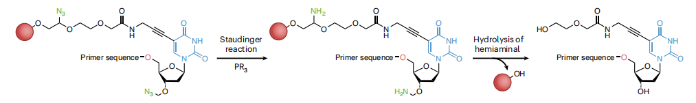 解决这一限制的可行策略需要一个结构简约的3'-OH保护基团,使dNTPs保持作为DNA聚合酶的活性底物的能力,可快速切割,并同时保持DNA完整性。基于叠氮的保护基团,一种非天然产物,可被用来盖住3'-OH,其可通过Staudinger反应(Staudinger reaction)去除。使用不同标记的荧光dNTPs,在碱基本身携带荧光团,可实现dNTPs的精确碱基结合(下图)。这一发现是开发NGS的第一步。可逆终止化学和四色荧光检测读出的发明使SBS无需进行电泳,因此更快,更准确。