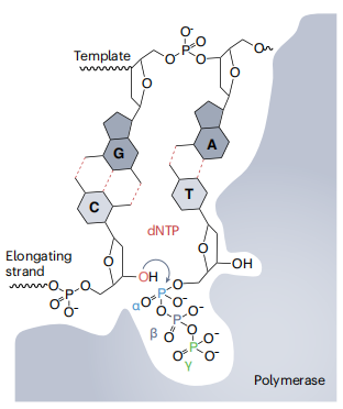 SBS通过可逆终止化学作用,使dNTPs碱基按序结合。天然聚合酶在 dNTP 结合之后不会暂停,结合速度快。一个关键的挑战是开发一种聚合酶来适应这种新的化学反应。