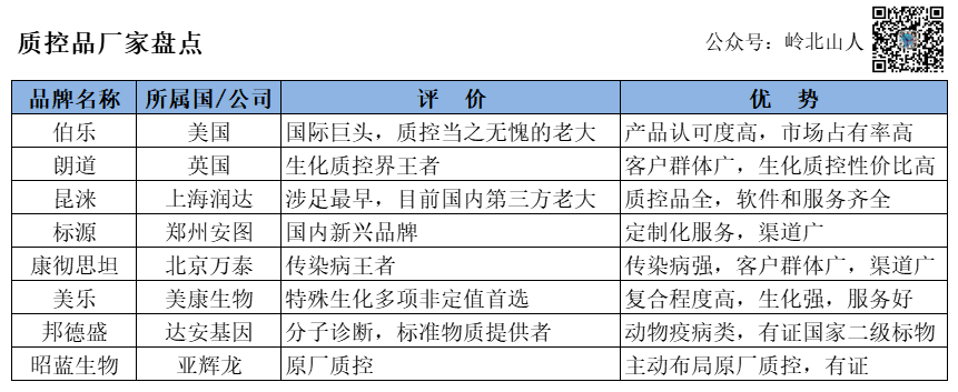 目前,NCCL(国家卫生健康委临床检验中心)全面针对主要临床检验项目开展全国室间质量评价计划。目前开展评价计划122项,涵盖临床生物化学、免疫学、血液体液学、微生物学、分子生物学、输血检验等专业,包括约315项检验项目,参加实验室约6000余家(包括医疗机构、采供血机构、疾病控制机构、国际旅游卫生保健中心和体外诊断企业等)。 作为检查分析仪器或方法性能物质,质控品应运而生。实验室做质控的目的是为了监控检测系统的状态,因此选择质控品最重要的原则,就是如实地反映检测系统的实际状态。目前市场上一般包括厂家配套的质控品和第三方质控品,其中 ISO15189 更推荐使用第三方质控品。长期以来,我国医疗机构临床实验室使用的质量工具--第三方室内质控,都被国外公司垄断,由于各种原因,国内介入这一细分领域的体外诊断企业少之又少。截至目前,我国临床诊断标准物质仍然处于起步阶段。根据检测类型:免疫分析、临床化学、血液学和止血、分子诊断、微生物学;根据产品和服务:质量控制产品、数据管理解决方案、质量保证服务;随着国家对医疗机构之间的检验检查结果互通互认,室间质评的要求将会提高,不同医疗机构之间的质量控制水平,将决定检验结果互认是否能推行。而作为实验室所需的质控品,必将迎来大的需求。当然,随着临床样本的检测质控要求提升,以及行业发展和检验实验室检验的水平提高,最终样本的质控环境将逐渐和“IFCC”的要求一致。在此大背景下,国内质控品的需求长期会大幅提升。而更多的企业参与其中,为实验室提供更多的质量保障,给行业带来产品和服务之外,增加了企业和产品之间的差异化竞争格局,更灵活运用产品+服务的优势!