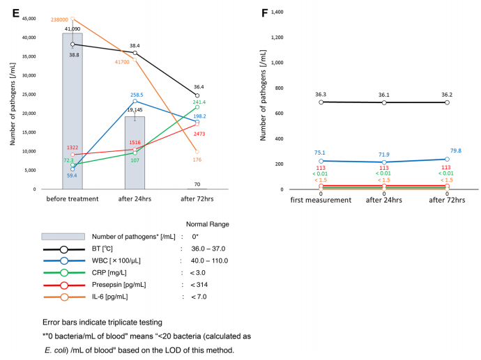 通过5例败血症患者,作者发现细菌数量是一种新的有用的生物标志物,比现有的生物标志物(BT、WBC、CRP、presepsin和IL-6)更敏感地反映治疗效果。目前的生物标志物反映的是宿主对微生物的免疫反应,因此不可避免地会造成时滞。尽管抗菌治疗有效,但目前的生物标志物在抗生素给药后24小时仍呈上升趋势。