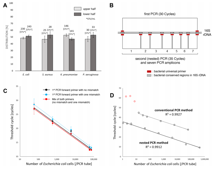 3. 第三步,采用巢式PCR法。此外,为了消除引物二聚体形成对定量的不利影响,将荧光采集温度设置为82°C。结果表明,Ct值与大肠杆菌计数/PCR管的对数线性相关(R2值)> 0.99(图D),定量限为大肠杆菌基因组DNA 1.0个/PCR管,线性动态范围(大肠杆菌基因组DNA 1.0 ~ 4.1 × 105个/PCR管)。