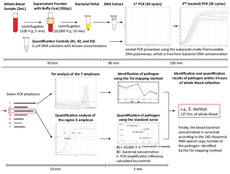 近日,一组来自日本的研究团队在杂志Scientific reports上发表了一篇题为“Novel rapid method for identifying and quantifying pathogenic bacteria within four hours of blood collection”的文章。文章中作者开发了一种真核生物来源的耐热DNA聚合酶,它没有细菌DNA污染,使临床样品中少量细菌的定量检测成为可能。作者还开发了一种基于熔解温度(Tm)的定量方法,可以根据Tm mapping法鉴定的病原体的16S rRNA操纵子拷贝数进行校正。这样在临床样品中可使用实时PCR对未知细菌进行鉴定和定量。与其他生物标志物相比,脓毒症血液样本样品中的细菌数量,更适合作为传染病的一种新的生物标志物。