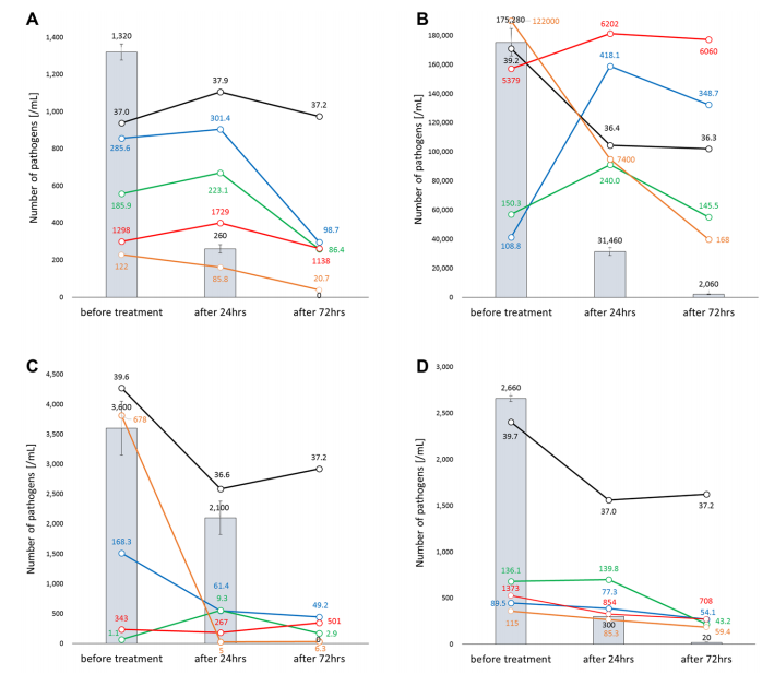 此方法在任何健康对照组的血液样本中都没有检测到细菌。对脓毒症血液样本(以及健康对照样本)中的致病菌进行鉴定和定量,然后检测细菌数量、BT、WBC、CRP、presepsin和IL-6值在抗生素治疗前、治疗后24和72 h的时间依赖性变化(如下图)。