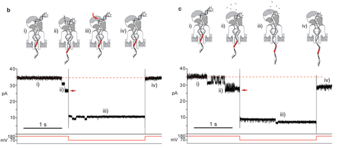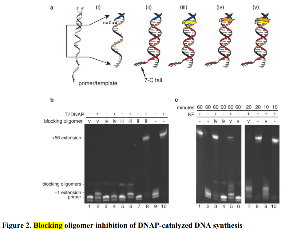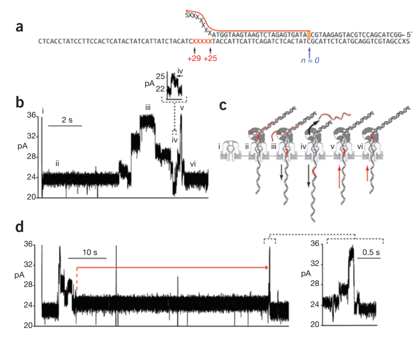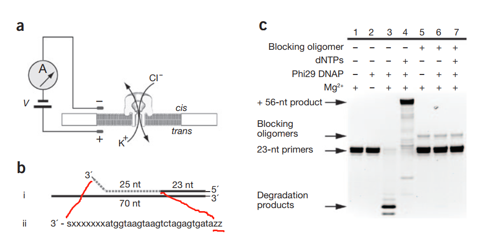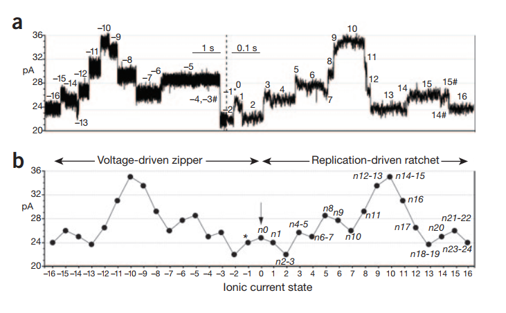 前言: 交叉着写点底层技术的文章吧;最近一直看纳米孔的老古论文,越来越觉得,技术的创新是那么困难,那么多课题组前赴后继,耗费了大量的精力和经费,往往也只是成为了后人的垫脚石,你根本不知道,技术创新何时能够量变到质变,也根本不知道你是否是那个上岸的幸运者; 国人科学仪器创新极少,metoo极多,固然有我们作为发展中国家本身底子弱、发展晚的必然因素,但如果基础科研继续没有严格的创新评判和激励,而产业经济调控、专利保护还是形同虚设的情况下,那劣币驱逐良币,创新必然没有土壤,行业必然极速内卷,待到安鸿遍野之时,国外的技术创新者又跨过了一条遥遥领先的新河,爬上了又一座我们必须仰望的高峰。 而国内一堆看到illumina专利过期了,才开始跟疯的所谓国产NGS企业,结局不言而喻。 承接三代测序学习笔记-技术起源3,本文我们来讲讲接头的发明故事;附上《繁花》大结局的某段字幕截屏作为前言总结。 马达蛋白的优选及棘轮运作原理 而经过技术起源1、2、3的学习,我们应该都知道了,三代测序的必备组件是,膜,减速蛋白(即马达蛋白),纳米孔蛋白。这是三块大零件。 在三代测序学习笔记-技术起源3里面讲到,MspA最终因为更短的读点造成更特异性的性能取代了a-HL纳米孔蛋白,然后大肠杆菌膜表面孔蛋白CsgG又因为更收缩的孔内读点成为替代者,再之后CsgG和GsgF形成的融合孔道蛋白又因为形成了更独特的双读头结构,成为了更优异的候选者。 而其实马达蛋白的选择也不是一帆风顺的。 理所当然,马达蛋白肯定必须有和DNA/RNA有极佳的亲和力,又有着棘轮/齿轮般的结构功能。科学家一开始瞄着的就是 天然的核酸酶类,大自然就是巨大的工具宝库,各种工具酶实在太多了,有一些公众号写得特别好,比如:用于“修饰核酸分子”的工具酶,“DNA聚合酶”都有哪些你知道么?;为了筛选可靠的工具酶类,比较知名的研究有:能结合单链DNA的大肠杆菌外切酶 I(Escherichia coli Exonuclease I ),能结合RNA的噬菌体phi8的APT酶(bacteriophage phi8 ATPase ),还有几种3'-5'外切酶活性缺失的DNA聚合酶如 家族A DNA聚合酶(A-family DNA polymerases)、大肠杆菌DNA聚合酶的Klenow片段(Klenow Fragment )、噬菌体T7的DNA聚合酶(bacteriophage T7 DNA polymerase, T7DNAP(exo-))等。 在这篇垫脚石文章(研究T7和KF)中:Replication of Individual DNA Molecules under Electronic Control Using a Protein Nanopore;Felix Olasagasti1, Kate R. Lieberman1, Seico Benner1, Gerald M. Cherf1, Joseph M. Dahl1, David W. Deamer1, and Mark Akeson1,*,作者做了非常有意思且烧脑的方法学探索: 然后通过复杂的缓冲液化学环境和正反电压的控制:穿过纳米孔,通过线头把阻断链撤掉脱落,带负电的DNA链通过纳米孔,但是控制好,不能都跑过去就完了!然后再反相电压,让核酸拉扯着DNA在纳米孔中反向移动,然后没有阻断链的保护下,DNAP又能结合上去,然后DNAP行使棘轮的功能,让DNA链再通过纳米孔。 可以想见,这种复杂的机制,带来了巨大的不可控性,难以使测序流程标准化、工业化。 还有一个问题是:T7DNAP(exo-)的确能组装在α-溶血蛋白(α-HL)纳米孔上,也能够在一定电压下将DNA运输到膜的另一端,但是施加电压后,很不稳定,降低了本来就困难的信噪比。 Yvette Kolodji, and Mark Akeson*。证明了phi29 DNAP 结合在纳米孔上的时间是家族A DNA聚合酶的10000倍。再结合phi29 DNAP本身的链置换活性(解链)和3'-5'外切酶活性,设计了两种过孔模式。 这两种机理看起来都不错,存在的问题是都需要依赖对核酸链3′末端进行化学保护:正常的3'末端是OH,而该文章发现如果3'末端是H的话,DNAP的3'-5'外切酶活性会被短暂地抑制。因此在这种条件下,供DNAP和核酸结合的时间窗口也仅有20min。这同样也是不适合商业化测序的。 该篇文章创造性地设计了一种全新的阻断引物,即让猪八戒抱着西瓜,但是下不去嘴。如下图b,25个碱基长度的阻断引物的5’端有两个吖啶集团,3'端同样也有非互补链的一个线头。下图c证明了这种结构的绝佳稳定性,在phi29 dNTPs (聚合酶延伸DNA的原料)和 Mg2+都存在的条件下,长达5h,保持不被DNAP的外切酶活性或聚合酶活性影响。 最后我们看下纳米孔标准建库方法: 最后一步加tether,是个什么用途呢?该分子就像一个船锚,用于锚定DNA或RNA链,防止在溶液中飘动,并促使其进入纳米孔中。具体什么成分,不想花篇幅了,我猜应该是某种亲脂成分,查专利,查文献,果然如此。 也有文献专门研究此方法: 至此,零件拼图结束. End. |
