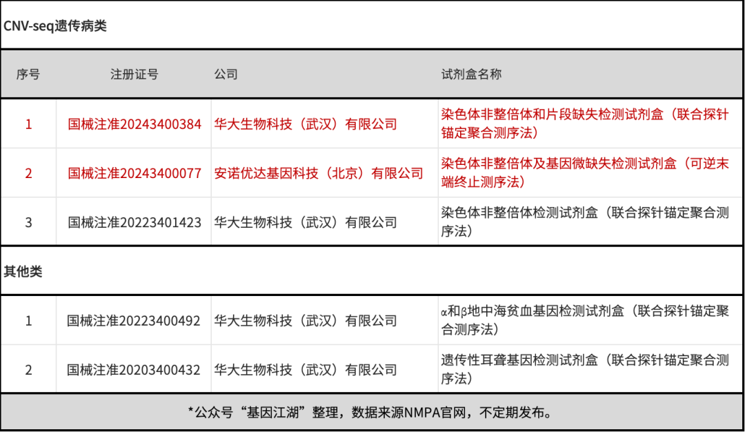 截至2.26日,NGS及周边领域最新获批信息汇总: 关注公众号,获取最新获批信息; - 较上期(2024年1月16日),此次新增以红色标注,含:赛纳生物(测序仪)、金匙医学(测序仪)、华大基因(CNV-Seq)、求臻生物(肿瘤多基因)、基准医疗(尿路上皮癌早检);