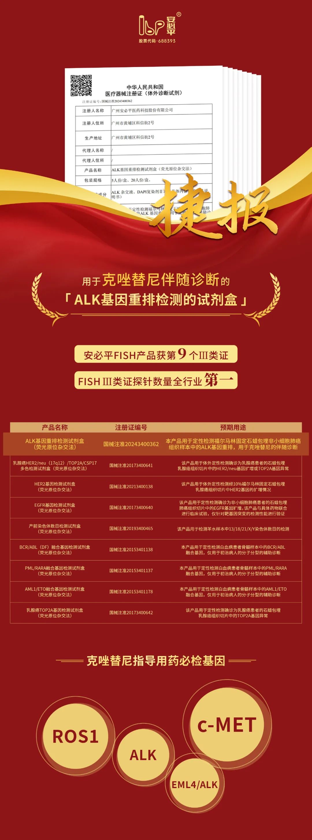 日前,广州安必平医药科技股份有限公司研制的ALK基因重排检测试剂盒(荧光原位杂交法)取得了国家药品监督管理局颁发的医疗器械注册证 (国械注准20243400362)。该试剂盒是国产第一张荧光原位杂交平台用于定性检测非小细胞肺癌患者的ALK基因重排,用于克唑替尼药物的伴随诊断检测注册证。该试剂盒基于荧光原位杂交平台,具有灵敏度高、特异性强,可在组织上原位检测,直观了解ALK基因改变的特点。 这是公司FISH平台获得的第9张三类医疗器械注册证。FISH也称为荧光原位杂交技术,其检测的特异性和敏感性都比较高,是ALK重排基因检测的金标准。