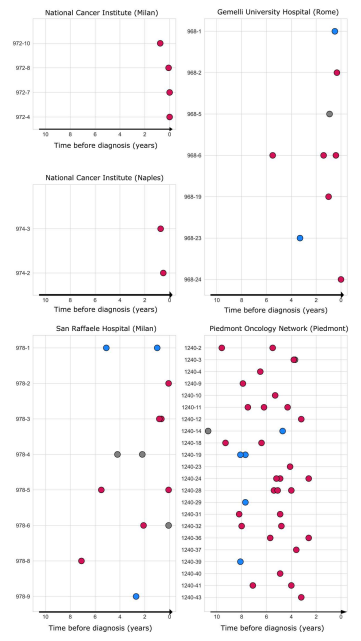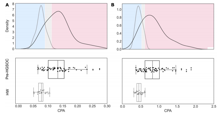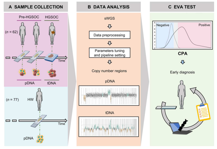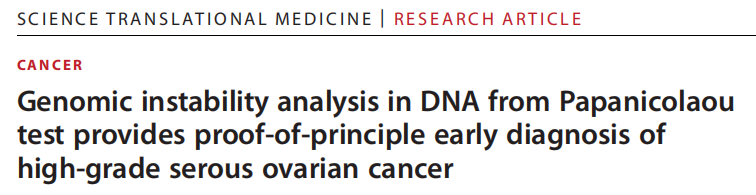卵巢癌是最致命的妇科恶性肿瘤,具有侵袭性强、预后差的特点,其中高级别浆液性卵巢癌(highgrade serous disease, HGSOC)是最常见、最致命的,确诊患者有70%以上在确诊后5年内死亡,而I期HGSOC的5年总生存率在90%以上。HGSOC在不同阶段的治愈率差异很大,这使得早期诊断HGSOC有可能提高生存率。多年来,为HGSOC开发早期检测的尝试一直令人失望。一些基于传统诊断方法的筛查研究,如单独或联合经阴道超声测定血浆CA-125,未能降低HGSOC死亡率。最可能的原因是,这些生物标志物的测定不够敏感,无法揭示肿瘤发展的初始阶段。 近日,一组来自意大利的研究团队在杂志Science translational medicine上发表了一篇题为“Genomic instability analysis in DNA from Papanicolaou test provides proof-of-principle early diagnosis of high-grade serous ovarian cancer”的文章。本研究的目的是为pDNA中体细胞拷贝数改变(SCNAs)的分析提供实验证据,并将其纳入命名为EVA(早期卵巢癌)测试中,可用于HGSOC的早期诊断。 图片来源:Science translational medicine 主要内容 HGSOC病例与健康女性对照的特点 本研究选择了回顾性和多中心收集的250份巴氏涂片,来自113名随后被诊断为HGSOC的妇女(pre-HGSOC)在不同时间点的样本,以及77名常规妇科筛查期间收集的健康妇女(HW)。pre-HGSOC在诊断时的中位年龄为60岁左右,接受巴氏涂片的HW的中位年龄为43岁。因为巴氏试验分析不再推荐绝经后妇女,很难收集年龄与pre-HGSOC妇女相似的HW的巴氏涂片。在撰写本文时,所有HW仍然活着,没有妇科肿瘤或任何其他肿瘤或其他妇科炎症性疾病的证据。从收集档案样本到诊断HGSOC的时间,pre-HGSOC为0个月~ 13.6年。 EVA测试流程。图片来源:Science translational medicine pDNA中体细胞拷贝数改变(SCNAs)分析 作者使用了低深度全基因组测序(sWGS)方法来检测从肿瘤样本纯化的DNA (tDNA)和pre-HGSOC pDNA中的SCNA。首先评估了tDNA中的全局SCNA特征。使用GISTIC 软件进行分析,证实了tDNA异质SCNA,3q26.31/8q24.12和16q21/ 12q24.13分别是最常拷贝数升高或下降的基因组区域。 然后,为了证明巴氏涂片中存在来自肿瘤细胞的DNA,作者研究了整个pDNA组中SCNA的存在。大部分(89%)pDNA中可检测到SCNA,包括广泛染色体区域的拷贝数升高或下降。下图描述了pre-HGSOC女性(ID:1240-11) tDNA和三个不同时间点pDNA的拷贝数概况。tDNA的特点是在所有染色体上都有大量的基因组畸变,而pDNAs则表现出大部分是整倍体基因组,拷贝数升高或下降区域很少。在所有时间点的pDNAs和tDNA样本中都可以检测到16号染色体(p11.1位点)拷贝数下降(下图)。从病理学角度来看,16号染色体上拷贝数下降已被报道为HGSOC的早期基因组改变。总之,数据显示,pre-HGSOC样本的pDNA基因组特征是SCNAs和TP53的致病性突变。这些异常在诊断前6年收集的样本中可见。 tDNA与诊断前不同时间点pDNA拷贝数谱比较。 图片来源:Science translational medicine EVA测试:测量pDNA中SCNA的整体景观 分析巴氏涂片整体基因组的不稳定性,而不是分析单个SCNA可能有助于区分HW和pre-HGSOC的妇女。作为整体基因组不稳定性的衡量标准,作者使用了先前发表的拷贝数谱异常(CPA)评分。 基于TCGA-OV HGSOC染色体最常改变区域的CPA,HW与pre-HGSOC pDNA的CPA分布有统计学差异(下图A)。这些分布定义了三个不同的区间:(i)第一个区间(0 ≤CPA < 0.0887)包括来自20个HW的pDNA (80 %)和11个pre-HGSOC的pDNA(17%),代表SCNA-negative。(ii)第二个区间(0.0887≤ CPA < 0.11207)包括来自5个HW的pDNA (20%)和10个pre-HGSOC的患者(15%),代表了不能确定。(iii)第三区间(CPA ≥0.11207)包括44个pre-HGSOC pDNA (68%),代表SCNA-positive。在此假设下,特异性为100%,灵敏度为67.69%,准确率为76.67%。 使用全基因组而非区域特异性方法重复了整个分析,CPA分布呈现出三个不同的区间:(i) 0 ≤CPA < 0.52372, (ii) 0.52372 CPA <0.61,(iii) CPA≥0.61,与之前TCGA-OV的结果类似(下图B)。在这种情况下,特异性、敏感性和准确性分别为96.00%、75.38%和81.11%。这一发现表明,尽管HGSOC基因组中的SCNA谱高度可变,但在pDNA中鉴定非整倍体区域依然可行,可使用EVA测试进行早期疾病检测。 HW和pre-HGSOC中CPA值的分布。 图片来源:Science translational medicine 纵向分析CPA以追踪基因组不稳定性演化 最后,为了系统地检查每个患者的临床病史中基因组不稳定性的演变,根据巴氏涂片收集的时间绘制了pre-HGSOC pDNAs中测量的CPA值。下图描述了pre-HGSOC是CPA值(根据全基因组方法测量)在很长时间内的演变,从很短(t = 0)到肿瘤发病前11年。这表明染色体不稳定的时间相对较长。总体而言,pre-HGSOC pDNAs样品: 75.4%(49 / 65)显示存在非整倍体基因组,15.4%(10 / 65)显示存在二倍体基因组,9.2%(6 / 65)为“不确定”。非整倍体基因组的存在可以在诊断前9年通过CPA分析检测到。与CPA分析结果一致,进一步的纵向证据证明TP53致病变异可以在宫颈内拭子中检测到诊断前至9年。 基因组不稳定性的演化。 图片来源:Science translational medicine 总结与讨论 作者通过对来自巴氏样本的DNA进行低通全基因组测序,以拷贝数异常(CPA)的方式检测基因组不稳定性。从pre-HGSOC妇女的巴氏试验样本中提取的DNA CPA值明显高于健康妇女,该方法可以在诊断前9年检测到HGSOC的存在。将CPA评分纳入EVA(早期卵巢癌)检测,其敏感性为75%,特异性为96%,准确性为81%。这项原理证明研究表明,通过分析宫颈内膜涂片DNA的基因组改变,早期诊断HGSOC是可行的。但此研究也有以下局限性:(i)它是回顾性的,样