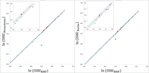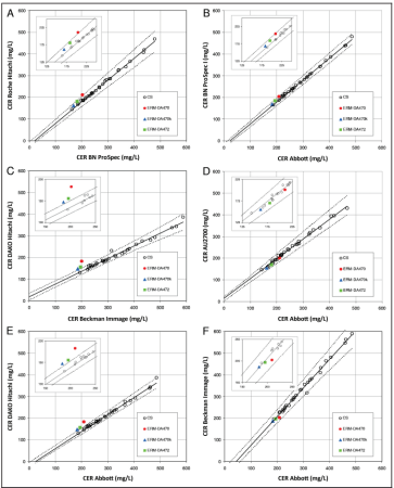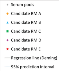 欧盟联合研究中心对胰腺淀粉酶参考物质,进行了互换性的实验。实验方案中,先前对临床样品的选择、参与评估互换性的候选参考物质、以及用哪些常规检测程序进行实验评估等,这些要求在前面几个微信中都已经做了介绍。 本想,因为IFCC工作组的互换性评估方案,对于这个参与互换性评估的这些专家们,是很新颖的。我想他们也正是想确实了解IFCC方案,较美国CLSI的互换性评估方案要好。但是,这篇文章最后的讨论总结,却无法说出究竟哪个方案更好的结论。 欧盟联合研究中心,在为ERM-DA470中铜蓝蛋白丧失了与常规样品间互换性的工作中,已经使用了美国CLSI EP30文件。 图1、2013年欧盟联合研究中心Zeger报告铜蓝蛋白与临床样品间,在多个常规方法检测中互换性的表现。附:图中各个有颜色的为被评估的三个参考物质:红色圆点为1993年制备的ERM-DA470;三角蓝色的为2009年制备的ERM-DA470k;方块绿色的为2010年制备的ERM-DA472。图中的黑线是Deming回归线,黑线上下两条虚线为95%可信水平的预测区间。 图2、α-淀粉酶催化浓度检测,对5个候选RM的互换性评估,按照CLSI C30-A叙述的具有预测区间的线性回归分析。 图1和图2表达的方式相同。评估互换性使用的就是美国CLSI EP30方式。 因此,在EP30的互换性实验方案中,很容易看出,哪个候选参考物质与临床样品在各个检测系统的表现,清楚地说明了问题。