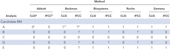 欧盟联合研究中心也使用了IFCC工作组的互换性评估方案,进行实验后的统计。文章没有详细的资料数据。但是给出了最后的结果。见以下表的内容。 表1、按照2个不同方式进行互换性评估,5个候选RM与5个常规方法的组合。注:a为CLSI C30-A互换性评估方式。B为IFCC的互换性评估建议的偏移差异分析。c为不可互换;d为可互换;e为没有结论。 我的注解:表上的数据1或0,分别表示有无互换性。1为具有互换性;0为无互换性。仔细看上面的数据。很难区分究竟是IFCC工作组的互换性方案、还是CLSI EP30互换性方案为好? 因此从实施的方便程度和理解的难易程度上看,IFCC工作组的互换性实验方案并没有更好的表现。 各位临床实验室同道,对2018年文章有需求的,可以提出。我发送给大家。 E N D 转载请注明出处 微信公众号:冯仁丰 |