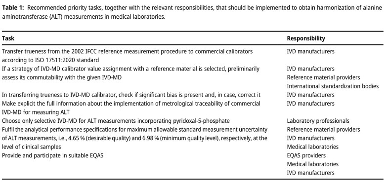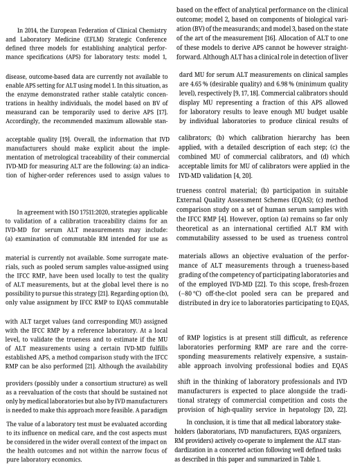 使用高阶 RM 是为商用校准器分配可溯源值的一种可能的替代方法。必须根据其预期用途和 ISO 15194:2009 标准仔细确定 RM 的特征,该标准列出了 RM 应记录的特征[8]。要将 RM 用作校准等级体系中的通用校准器,其证书必须提供有关信息,说明其在所有商业测量程序中与临床样本的互换性,以便将其用作实施计量溯源的高阶校准器[9]。遗憾的是,目前还没有完全符合这些要求的 RM。实验室医学可追溯性联合委员会(JCTLM)数据库列出了一个 ALT 的 RM(ERM®-AD454k/IFCC,欧洲委员会联合研究中心),但没有提供有关其可互换性的确切信息,因为该材料的预期用途仅限于控制 IFCC RMP 的性能[10]。