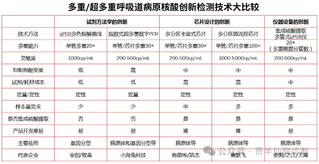 国内的分子诊断大厂更加的“另辟蹊径”,相比于基础技术的创新,仪器平台的创新近年来好像成为了国内IVD大企业的首选。该方案依旧是利用多管的方法学,基于自动化设备的改进,把核酸提取和PCR检测进行自动化整合,同样实现了自动化的多重病原体核酸检测。该类产品需要在设备内进行开盖的核酸提取操作,开发时需特别注意核酸污染问题。总的来看,当前基于方法学的创新还处于产品化的初期,除多色熔解曲线的HPV和结核分型产品外,其它检测产品相对较少,多是中小企业在探索前行。值得一提的是,指数式超多重数字PCR技术兼具多重的定量检测特征,是值得关注的核酸检测创新技术。虽然当前呼吸道病原等检测主要采用了定性检测的方案,展望未来,定量检测或许也会成为未来的主流?也是中小企业实现弯道超车的一条可选之路。据某疾控专家介绍,随着多重感染日益增多,定量检测技术对于主要和次要病原的判断以及治疗方案的制定具有极大的临床价值。基于芯片创新的产品,受限于居高不下的价格,以及比较封闭的体系,受众面比较有限;因其自动化和便捷化,在成本控制合理后,市场想象空间较大。目前国内已有不少跟随梅里埃和凯杰的玩家,多数都还处于早期阶段;希望国内企业在产品开发中能够领悟到现有产品的精髓,在降低价格的同时保持产品的性能,在未来也定会有广阔天地。该类产品的开发涉及芯片,仪器和试剂的匹配,产品开发者可以根据自身实力慎重考虑。仪器平台的创新本身技术壁垒相对较低,但是在IVD大厂纷纷入局的形势下,对于中小企业来说竞争压力较大。此外,也呼吁大企业在追求快速产品化的同时,对于基础性技术也应多加关注,毕竟基础技术的创新,才是行业发展的未来。