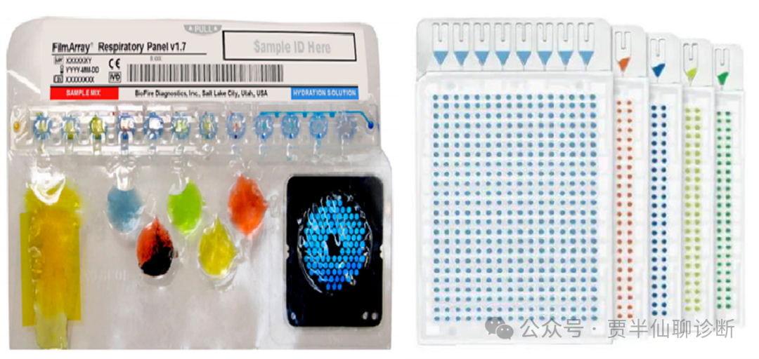 Ⅰ. 试剂方法学的创新:  多色熔解曲线技术是在qPCR的平台上实现的一种超多重检测技术,该技术利用熔解曲线峰的差异实现多重靶标的检测和区分,在单管内最多可实现20+的分型检测,已经成功应用于HPV分型和结核分型耐药分型中(宝创/致善)。该技术相比荧光PCR而言多重性具有极大优势,检测灵敏度却明显降低。目前,纳全生物[1]等基于该技术开发出了单管多重呼吸道病原体核酸检测产品。  另一种试剂创新方法学是指数式超多重数字PCR技术,该技术基于数字PCR,通过荧光编解码技术,在单管可以同时实现30+病原体靶标检测。由于数字PCR的分割原理,降低了靶标的相互交叉干扰,对复杂样本的检测具有较大的优势,可以实现更高灵敏的检测。指数式超多重数字PCR技术,也是目前唯一可以兼具多重和定量检测的技术方法。据悉,小海龟科技[2]采用超多重数字PCR技术,成功开发出单管12重和23重呼吸道病原体检测试剂盒,26重血流感染项目正在开发中。FilmArray 卡盒 (左)和TaqMan Array Card微流控芯片:  通过卡盒式芯片的创新和微流控芯片的创新,实现病原体的多重检测也是近年来的热点,尤其是以梅里埃的FilmArray为代表的产品,成为呼吸道检测领域的标杆,得到行业的争相效仿。通过自动化卡盒封装,集成了核酸提取和检测于一体,操作便捷灵活,国内呼吸道产品的销售价格据说在2000元/测试。类似产品还有凯杰的“小蓝盒”。赛默飞[3]推出的TaqMan Array Card采用384孔板分区的微流控芯片技术,在每一个微腔室内预包埋分子探针,每个反应孔约1μL,可以实现100+病原体的单次检测;然而,较小的反应体积,也降低了检测病原的灵敏度。