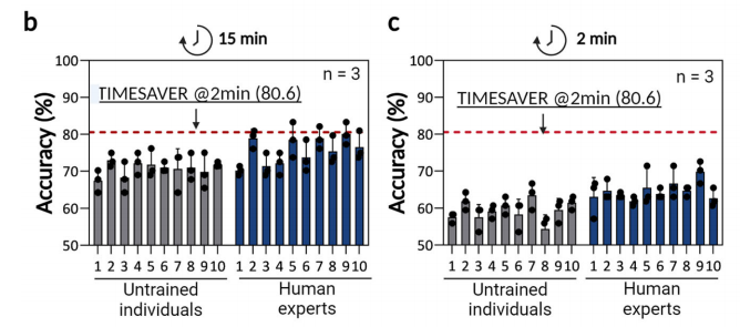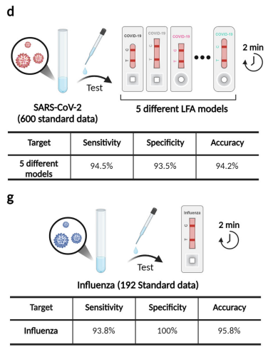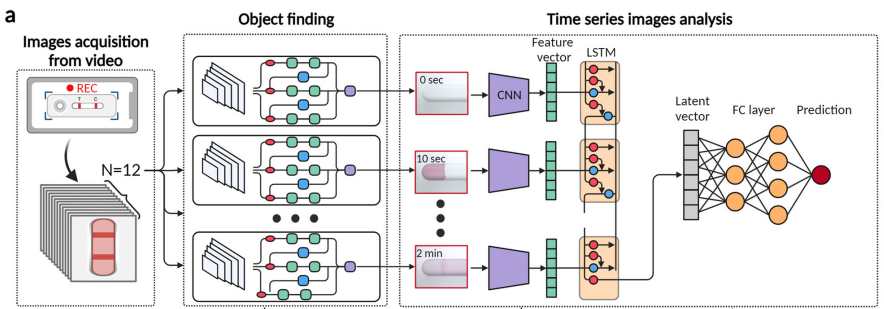 在即时检测(POCT)中,实现高灵敏度和可负担的快速诊断是一项关键挑战。POCT方法大致分为基于免疫测定和基于分子的方法。在大多数商业化的分子诊断中,涉及样品制备步骤以及分析过程,诊断时间可长达几个小时。在基于免疫测定的诊断中,ELISA作为最流行的免疫分析平台,需要大约3-5小时进行分析。相比之下,快速诊断测试(RDT),也通常需要15分钟。 在紧急医疗护理领域,快速和准确的诊断在急诊室(ER)具有至关重要的意义。例如,心肌肌钙蛋白I在健康个体中检测不到,但在心肌梗死患者中显著升高,及时诊断和处理至关重要。在这种危急情况下,快速识别疾病和病症对患者的预后产生深远影响。在涉及传染病的情况下,及时诊断在确定致病病原体和感染方面起着关键作用,从而促进及时实施感染控制措施,以避免潜在的疫情爆发,并保障患者和医疗保健提供者的健康。 人工智能(AI)技术已经成为使用卷积神经网络(CNN)进行基于医学图像诊断的焦点,包括x射线、计算机断层扫描(CT)和磁共振成像(MRI)等模式,其应用有望显著提高诊断准确性,同时彻底改变复杂医学图像的解释和分析。 近日,一组来自韩国的研究团队在杂志Nature Communications上发表了一篇题为“Rapid deep learning-assisted predictive diagnostics for point-of-care testing”的文章。文章提出了一种将时间序列深度学习算法与测流分析平台相结合的方法,可以显着减少分析时间,只需1-2分钟。这种方法用途广泛,适用于一系列疾病,包括COVID-19和流感等传染病,以及肌钙蛋白I和hCG等非传染性生物标志物。在临床样本的盲法测试中,此方法不仅实现了短至2分钟的诊断时间,而且超过了传统的人类分析在15分钟内完成的准确性。 图片来源:Nature Communications 主要内容 TIMESAVER快速测定 商业PCR和ELISA检测需要几个小时,是劳动密集型的,而且成本更高。快速试剂盒通常提供成本效益高的现场诊断。作者介绍了一种基于人工智能,可优化LFA免疫分析的算法TIMESAVER。用于预测结果的深度学习架构TIMESAVER,由三个组成部分组成:YOLO、CNN-LSTM和FC layer(如下图)。目标是在现有的商用试剂盒中建立最快的诊断时间,同时保持准确性和可负担性。TIMESAVER利用时间序列深度学习架构和基于人工智能的验证可将分析时间显著缩短至1 - 2分钟。 TIMESAVER深度学习架构。 图片来源:Nature Communications 用TIMESAVER检测传染病 下图展示了使用TIMESAVER模型的2分钟测定法对传染病的评估,包括COVID-19抗原和流感A/B。作者为TIMESAVER开发了一个回归模型,并根据制造商提供的指南将回归值分为五类:高、中、中低、低和阴性对照。结果表明,基于人工智能的决策过程在2分钟内完成,灵敏度为96.3%,特异性为100%,准确率为97.6%。通用性是TIMESAVER算法的一个重要特征。作者测试了额外的5个SARS-CoV-2 LFA模型,平均灵敏度和特异性分别为94.5%和93.5% (图e)。ROC曲线显示AUC值达到0.98。 作者进一步扩大了验证工作,包括甲流测试。流感检测试剂盒的敏感性为93.8%,特异性为100%,准确性为95.8%(图g)。ROC曲线的AUC值为0.97。通过TIMESAVER模型增强LFA结果表明,它可以实现快速的分析时间,同时仍然保持有效的即时诊断的敏感性和特异性。 使用TIMESAVER模型对传染性疾病(COVID-19,流感)的商用LFA进行2分钟检测的评估。图片来源:Nature Communications 利用TIMESAVER 分析急诊室(ER)非感染性生物标志物 作者进一步验证了TIMESAVER检测非感染性生物标志物的性能,包括肌钙蛋白I和绒毛膜促性腺激素hCG。肌钙蛋白I在0.4 ng/ml以上的临床相关性,临界值设定为0.5 ng/mL,并根据LFA制造商指南建立了5级分类。结果显示灵敏度为96.9%,特异性为98.4%,准确性为97.9% (图a)。ROC曲线的AUC值为0.99,显示出很高的准确性。 除此之外,hCG的敏感性、特异性和准确性分别为97.5%、95.0%和96.7% (图d)。ROC曲线得出的AUC值为0.95,同样表明了TIMESAVER模型在2分钟检测中实现多重分类的有效性,强调了它在快速诊断场景中的实用性。 利用TIMESAVER分析急诊室(ER)非感染性生物标志物。 图片来源:Nature Communications 使用临床样本进行盲测 作者评估了来自三个不同组的盲测SARS-CoV-2快速试剂盒数据:未经训练的个人、人类专家和TIMESAVER。在15分钟分析图像中,未经训练的个人达到了70.7%的准确率,而人类专家达到了78.1%。当检测时间减少到2分钟 (图c)时,未经训练的个人和人类专家的准确率分别下降到59.4%和64.6%。相比之下,TIMESAVER模型在性能上超过了人类专家和未经训练的个人,即使在2分钟检测中也达到了80.6%的更高准确率。 由未经训练的个人和专家进行的人类视觉评估显示准确性下降。在中低滴度类别中,未经训练的个人平均准确率仅为29.2%,人类专家为37.2%。而TIMESAVER算法达到了84.6%的准确率。低滴度类别结果也类似。在不同浓度的情况下,TIMESAVER算法始终提供比人类视觉评估更可靠和准确的数据,有效地消除了人类视觉评估中的可变性。 结果和讨论 在诊断中,实现高灵敏度和快速处理的双重目标对POCT至关重要。TIMESAVER系统证明了它在2分钟内可提供可靠结果。这一成就强调了与TIMESAVER算法相关的一系列重要的实际好处: 1. 快速检测:能在1-2分钟内提供结果,与人类专家在传统的15分钟检测中取得的准确性相媲美。 2. 不同LFA模型和目标的通用性:在感染性和非感染性生物标志物的不同LFA模型中验证TIMESAVER算法突出了其广泛的适用性。 3. 对公共卫生的影响:减