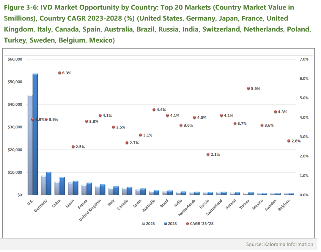 Kalorama Information发布的《The Worldwide Market for In Vitro Diagnostic Tests, 16th Edition 》(2023年8月)报告,2023年全球IVD市场规模最大的依然是美国,约占全球IVD市场规模的42%;欧洲地区约占27%,排第二;中国的IVD市场规模约占6%,排名第三,日本、加拿大次之。