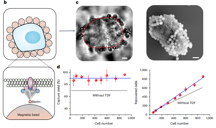 循环肿瘤细胞(CTCs)被认为从原发肿瘤分离并进入血液,直到侵入新的组织部位并产生转移。CTC正在被研究作为癌症早期诊断和预后的生物标志物。受体−配体在细胞膜上的相互作用是非线性的,不遵循经典的钥匙-锁模型。因此,在探针上对配体的空间排列和化学计量学进行编程的能力可以克服CTC捕获中的这些限制。 近日,一组来自中国的研究团队在杂志Nature Protocols上发表了一篇题为“Functionalized tetrahedral DNA frameworks for the capture of circulating tumor cells”的文章。文章描述了DNA -四面体框架偶联的适体“n-simplexes”,可以自行定义空间排列和化学计量,用作特异性靶向细胞膜上受体-配体相互作用的探针。作者描述了针对CTC表面表达的上皮细胞粘附分子的n-simplexes的合成、表征和亲和力测定,并进一步详细介绍了从患者血液样本中捕获CTC的方法。 图片来源:Nature protocols n-simplexes的设计 n-simplexes是将配体(EpCAM适体)构建在DNA四面体的顶点上。作者将合成TDF的单链 DNA的3’端扩展了15个碱基。扩展片段可与互补的适体杂交,使适体在TDF合成过程中偶联在TDF的顶点上。通过控制TDF顶点上的适体的化学计量(1、2或3),可以构造n-simplexes(0-simplex、1-simplex和2-simplex)。整个合成过程是通过一个退火步骤来完成的,没有任何额外的步骤(如下图)。 n-simplexes的构建。图片来源:Nature protocols n-simplexes的表征 为了验证n-simplexes的合成,作者使用PAGE电泳来估计合成产率,并通过AFM和透射电镜对配体进行成像。为了在单分子水平上测量n-simplexes适体的化学计量学,作者使用全内反射荧光显微镜(TIRFM)来表征含有Cy3-、Alexa 647-和Alexa488修饰的2-simplex适体。通过逐步单分子荧光光漂白技术可以定量n-simplex适体的精确数量(图c)。 n-simplexes的表征。图片来源:Nature protocols n-simplexes的结合亲和力比较 为了表征n-simplexes与肿瘤细胞之间的结合亲和力,作者采用竞争试验来比较单个n-simplexes的IC50(图b)。结果显示,IC50值与n-simplexes的效价呈反比。连接到DNA四面体上的适体越多,则IC50越低,表明亲和力越高。 n-simplexes的亲和力测定。图片来源:Nature protocols n-simplexes捕获肿瘤细胞 作者使用了生物素标记的2-simplexes和链霉亲和素标记的磁珠,利用磁分离技术可以分离与2-simplexes结合的肿瘤细胞。细胞膜上的磁珠可以作为2-simplexes细胞结合能力的一个指标(图b,c)。细胞捕获后可以保持细胞活力,促进其随后的培养和分子分析。作者捕获了具有EpCAM高表达(MCF-7细胞系)和低EpCAM表达(MDA-MB-231细胞系)的肿瘤细胞。n-simplexes对两种细胞系均表现出较高的捕获效率。 n-simplexes捕获肿瘤细胞。图片来源:Nature protocols n-simplexes应用于 临床患者的血液中分离CTC 使用此方法对健康对照、乳腺癌患者的CTC进行定量分析。捕获的CTC数从0~44个CTC/ml不等,表明该方法具有较高的捕获能力。在健康对照、良性和转移性患者中对CTC计数的鉴别显示了此方法在癌症诊断方面的潜力。 从乳腺癌患者样本中捕获CTC。图片来源:Nature protocols 方法的应用 n-simplexes结构可用于各种细胞识别和结合模式。作者已经使用n-simplexes来检测CTC细胞膜上表达的EpCAM受体。也可使用n-simplexes来检测内吞作用或膜粘附。 n-simplexes可以用不同的识别元件进行功能化。通过用其他抗原的适体取代EpCAM适体,n-simplexes可用于捕获其他肿瘤细胞。使用此方法已经从癌症患者的血液中分离出CTC。值得注意的是,此方法可激发由DNA框架编程的各向异性适体的开发,以及设计了基于TDF适体有序纳米界面的微流控芯片,用于肿瘤细胞捕获。作者预计,n-simplexes可以用于检测血液样本和其他生物液体如血清和尿液中的其他生物标志物(如循环外泌体)和病原体。 与其他方法相比 血液中CTC的超低丰度(转移性癌症患者每1×109个血细胞中存在1个)是对CTC捕获的一个技术挑战。传统的微流控分离方法依赖于肿瘤细胞与正常血细胞的不同大小,但表现出有限的分离特异性。为了提高特异性和捕获效率,人们设计了多价探针,以及具有多价适体功能化纳米界面或DNA纳米球的微流控装置已经被测试用于捕获。此外,生物特异性单层抗体涂层已被用于具有高灵敏度的CTC的多价捕获。然而,这些多价策略忽视了细胞表面高度复杂的非线性特性,未能实现所需的空间排列可控性和化学计量学可编程性。 相比之下,n-simplexes中配体空间排列和化学计量学的精确调控模拟了细胞膜上的受体−配体相互作用。利用具有1-3个化学计量学的DNA纳米结构,作者已经能够从癌症患者的血液样本中捕获CTC。 方法的局限性 虽然这种方法是高度灵活的,但它主要受到所需的大量步骤的限制。n-simplexes的制备和表征过程需要11.5小时,从临床样品中捕获CTC和数据处理每六个样品需要约5小时,捕获细胞的下游分析通常需要5.5小时。作者目前正在尝试自动化程序,这将有助于标准化方法。此方法一次只能检测六个样本,不能满足高通量临床样本检测需求。如使用nano plotter和生物芯片扫描仪,能够在24小时内检测~5万个样本,可以大大提高吞吐量。此外,该方法还受到探针的特异性的限制。不表达EpCAM或其他靶向受体的CTC将不会被检测到。为了准确捕获异质CTC,正在考虑基于TDF的混合配体。作者希望在不久的将来集成这些CTC检测设备,将整个过程自动化。 |