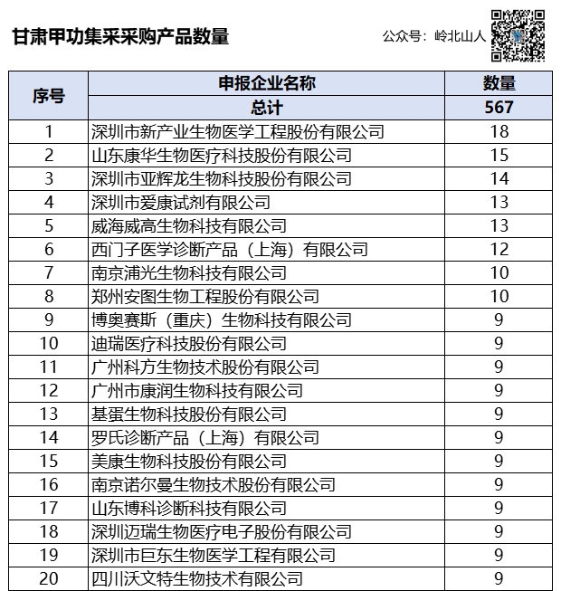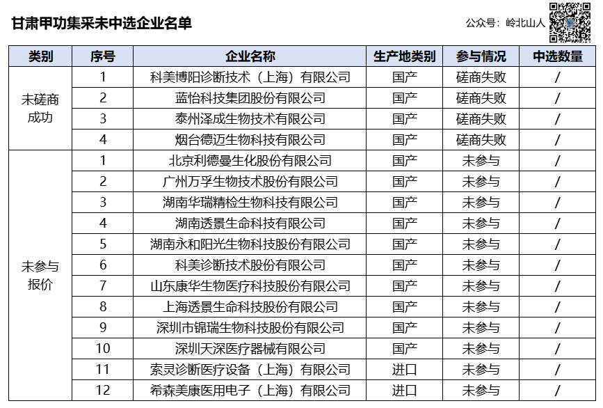 根据2023年1月1日-2023年12月31日医疗机构甲状腺功能检测试剂采购品种的历史配送量,得出首年意向采购量。从首年意向采购量来看,整体需求量在900万人份左右,而甲功5项占比均超过10%。其中TSH需求量最大,170万人份左右。5项合计达到83%,占绝大多数。而抗体和蛋白的占比相对较少,最低需求量只有12万测试。 根据甘肃省医保局公布的最高有效申报价,从限价可以看出,甘肃省收费相对较低,而限价占收费比例也很低,最高占比38%,最低占比只有23%。根据计划,3月15日,组织了线上开标,并于产生拟中选结果,并进行了公示。62家企业489个产品参与报价,经专家评审,58家企业458个产品拟中选,中选率分别为93.55%、93.66%。按上年度实际采购加权平均价测算,平均降幅42.07%,首年预计可节约资金3950万元。按甘肃医保局公布的平均降幅,其实还是比较出乎意料的。因为按评分+磋商的规则,经济技术分更倾向于或有利于大厂家,这些大厂只需要降很低的价格,就能获得比较高的得分。而众多的小厂家,经济技术分就在25分左右,更多的需要靠降价拿到高分。如果不能第一规则中选,就要进行两轮的磋商。而磋商的价格,要参考最低价再磋商下降。而冲低价的厂家,无疑会拉低最低有效申报价格,也会降低其他厂家的实际得分。如果按平均降幅42.07%计算,在甘肃一级收费的占比,最低占比只有13.5%了,这个比例,还是相对比较低的。 根据公布的信息整理,可以看出,74个厂家中,有12个厂家未参与报价;在31个磋商厂家中,有4家没有磋商成功: