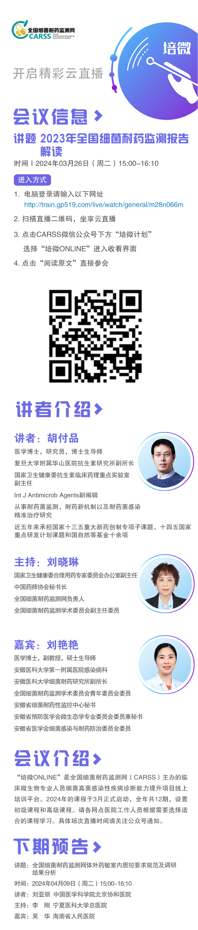 “培微ONLINE”简介 为落实《遏制微生物耐药国家行动计划(2022-2025年)》,加强对细菌耐药的防控,发展和完善细菌耐药监测体系,提高我国医疗机构临床微生物检验人员感染性疾病诊断能力和细菌耐药监测水平,提升临床微生物人员在医疗机构抗菌药物管理体系中的作用和价值,国家卫生健康委合理用药专家委员会与中国药师协会于2018-2023年连续6年组织实施了“临床微生物专业人员细菌真菌感染诊断能力提升项目(培微计划)”。 “培微ONLINE”是“培微计划”的一个重要组成部分。2024年计划举办12期,设置初级课程和高级课程。请各网点医院工作人员根据需要选择适合的课程学习。具体场次直播时间请关注公众号通知。 |