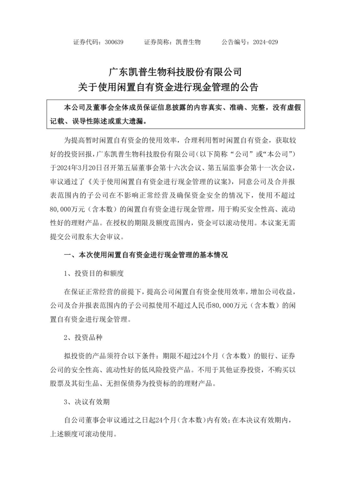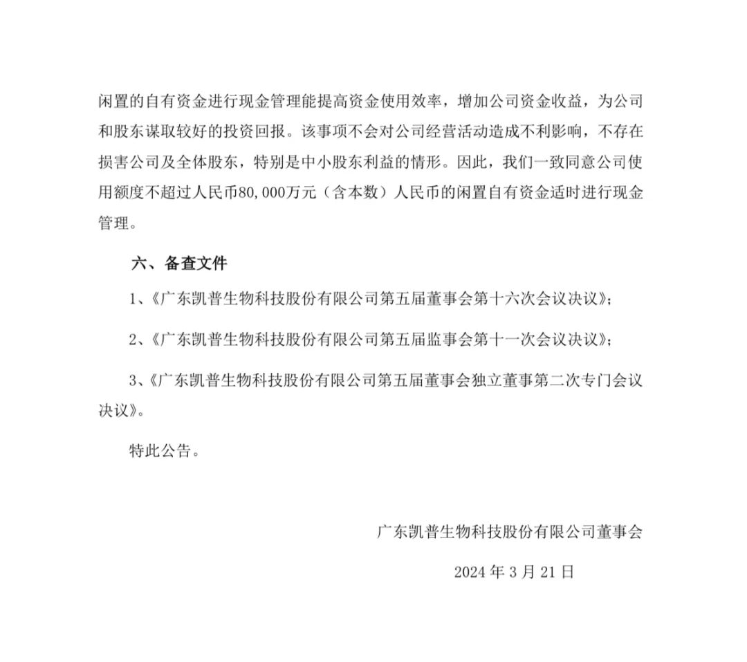 3月21日,广东凯普生物科技股份有限公司发布公告,为提高暂时闲置自有资金的使用效率,合理利用暂时闲置自有资金,获取较好的投资回报,广东凯普生物科技股份有限公司(以下简称“公司”或“本公司”)于2024年3月20日召开第五届董事会第十六次会议、第五届监事会第十一次会议,审议通过了《关于使用闲置自有资金进行现金管理的议案》,同意公司及合并报表范围内的子公司在不影响正常经营及确保资金安全的情况下,使用不超过80,000万元(含本数)的闲置自有资金进行现金管理,用于购买安全性高、流动性好的理财产品。在授权的期限及额度范围内,资金可以滚动使用。本议案无需提交公司股东大会审议。 在保证正常经营的前提下,提高公司闲置自有资金使用效率,增加公司收益,公司及合并报表范围内的子公司拟使用不超过人民币80,000万元(含本数)的闲置自有资金进行现金管理。 拟投资的产品须符合以下条件:期限不超过24个月(含本数)的银行、证券公司的安全性高、流动性好的低风险投资产品。不用于其他证券投资,不购买以股票及其衍生品、无担保债券为投资标的的理财产品。 自公司董事会审议通过之日起24个月(含本数)内有效;在本决议有效期内,上述额度可滚动使用。 具体公告内容如下: |