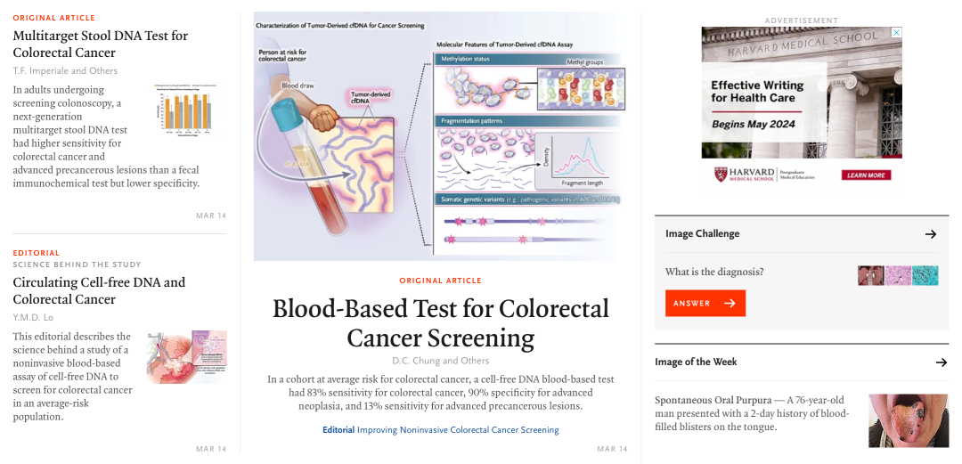 在老奸巨猾的老炮面前,小白虽勇气可嘉,但总显得有点愣头青 历史上首次,NEJM在同一天发表了两个肠癌早筛研究。 从版面上看,血检肠癌早筛的ECLIPSE研究作为“新面孔”占据了更大的篇幅,而代表了Exact Sciences心血的BLUE-C只能屈居次席。 之前也有朋友做了简单的分析,但确实有点过于简单了,完全无法满足我们吃瓜的需求 事实上,这是一次极好的机会,几乎同时期开展的两个研究可以让我们尝试看到肠癌早筛路线之争的当前答案。 可以从这么几个角度来吃瓜: