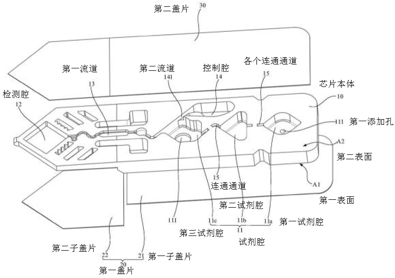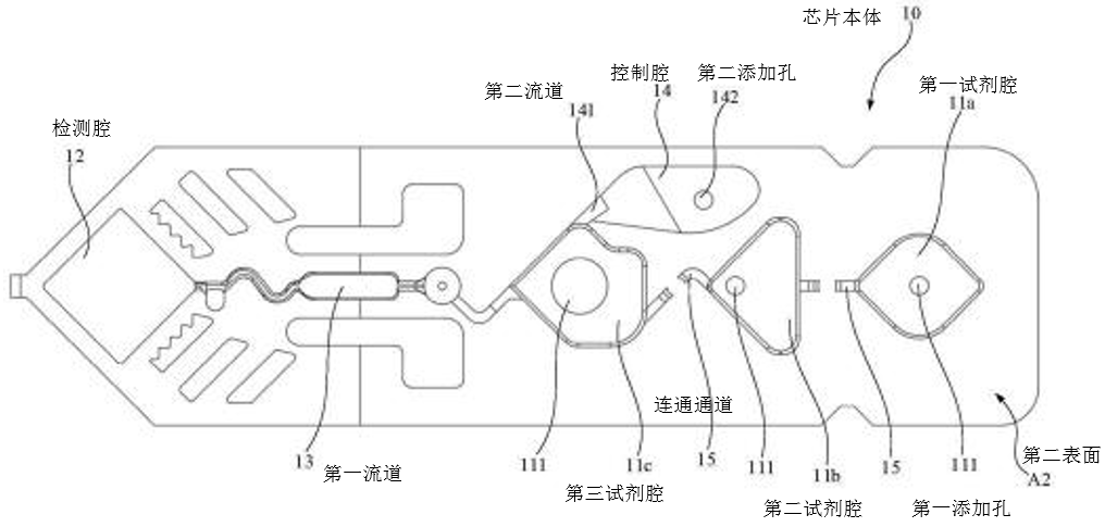 本专利结合离心机与蜡阀设计了一个核酸检测微流控芯片。 芯片操作流程 在实际使用时,通过离心机产生振动,使得样品和核酸提取试剂在第一试剂腔11a内混匀,并充分反应。然后在离心运动的作用下第一试剂腔11a内的混合液进入第二试剂腔11b,并与第二试剂腔11b内的核酸反应液混匀,且充分反应。然后再在离心运动的作用下第二试剂腔11b内的混合液进入第三试剂腔11c,并与第三试剂腔11c内的核酸反应液混匀。然后再在离心运动的作用下第三试剂腔11c内的混合液通过第一流道13进入检测腔12内。 图 1 关键技术点如下 控制腔14内预置有能够在触发条件下于流态与固态之间切换的第一封堵件。该控制腔14内的第一封堵件转化为流态后能够在离心作用下流动至第一流道13,并在第一流道13内转化为固态,以封堵该第一流道13。 第一封堵件需要采用惰性材料,确保与样本、各个试剂等均不发生反应,从而避免对核酸提取、检测前处理及核酸检测造成不良影响。可选地,第一封堵件可以采用石蜡件。 芯片本体10还具有多个连通通道15,每相邻两个试剂腔11之间通过连通通道15连通,即通过连通通道15实现相邻两个试剂腔11连通。每一连通通道15预置有用于封闭连通通道15的第二封堵件,该第二封堵件能够在触发条件下由固态转化成流态。 图 2 试剂腔11的数量为三个。第一试剂腔11a用于容置核酸提取试剂和样品,第二试剂腔11b和第三试剂腔11c用于容置核酸反应试剂。核酸提取试剂可以是裂解试剂等,核酸反应试剂可以是MIX试剂或TAQ(Thermus Aquaticus,水生栖热菌)酶。其中,MIX试剂可以包括PCR缓冲液和/或生物酶等。 图 3 可利用各个第三添加孔151将第二封堵件添加至各个连通通道15内,以封堵各个连通通道15。 参考文献 一种核酸检测芯片及核酸检测方法.CN114231408A ---------------------------------------------------------------- |