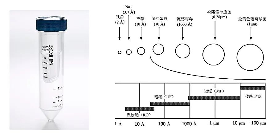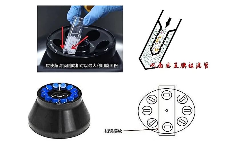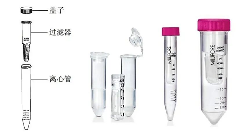 超滤离心管是一种膜过滤设备,是用于分离液体中不同分子或粒子的装置。它利用特殊的超滤膜,通过应用压力将液体样品推动穿过膜,从而分离不同分子或粒子的大小,广泛用于蛋白质、DNA和生物分子的浓缩、纯化和脱盐。 一、超滤与微滤 1、微滤 微滤 (Microfiltration) 涉及利用微孔膜介质去除溶液中尺寸为 0.1 μm 至 10.0 μm 的颗粒或生物体。而超滤膜的过滤范围为0.01μm至0.1μm。 微滤膜广泛应用于生物制药行业中的预过滤和除菌过滤。 在细胞实验中,微滤最常用于样品和培养基的灭菌(0.1μm微滤膜可去除支原体)。 此外,在核酸和蛋白质分析之前,使用微滤膜可以有效地从细胞裂解物中去除完整的细胞和细胞碎片。 此步骤对于确保下游应用中结果的准确性至关重要。 通过微滤,研究人员可以获得纯化的样品,从而提高核酸和蛋白质相关研究的灵敏度和特异性。 2、超滤 超滤 (Ultrafiltration) 也是一种膜过滤,通过压力或浓度梯度等力使料液通过半透膜进行分离。 超滤膜能够截留尺寸范围为1-1000kDa(MW)的分子,并允许盐和水等小分子通过。 超滤是大分子脱盐、浓缩最方便的方法,已经在蛋白、抗体、病毒、核酸、囊泡等样品制备中建立标准操作。与沉淀法相比,超滤法更为温和,避免了可能导至生物大分子失活的相变。 三、超滤离心管 超滤离心管是一种利用离心力驱动中小体积溶液通过超滤膜,进行快速浓缩、渗滤和缓冲液置换的装置。 它由盖子、过滤装置和离心管组成。 5、超滤管的放置 超滤管在离心机中的摆放需要符合切向流过滤要求,即水流方向与膜面平行。 1)水平转子 使用水平转子时放置没有特殊要求。 水平转子又称甩平转子、荡平转子,转头静止时,处于转头中的离心管中心线与旋转轴平行,转头旋转加速时,离心管中心线由平行位置逐渐过渡到垂直位置,即与旋转轴成90⁰角。此种转子主要用于样品做密度梯度离心,颗粒移动距离长,相应离心时间一般也较长,溶液中的组分相对于管壁的位置在离心过程中和离心后不发生改变,因此离心效果好,能够分离密度差小的样品。 2)固定角转子 使用角转子时,双面垂直膜超滤管放置方式要求滤膜侧向相对。 6、超滤管的截留分子量和膜孔径关系 超滤管是一种膜过滤设备,用于分离液体中不同分子或粒子的装置。它利用特殊的超滤膜,通过应用压力将液体样品推动穿过膜,从而分离不同分子或粒子的大小。这种分离过程基于分子截留量,也就是膜的孔径大小,决定了哪些分子可以通过膜,哪些分子被截留在膜上。 分子截留量是表示超滤膜的选择性的重要参数,通常以道尔顿(Da)为单位,分子截留率表示膜可以截留的最大分子或粒子的大小。具体来说,如果膜的分子截留率是10kD,则该膜能够截留分子量小于或等于10000的分子,而分子量大于10000的分子将被截留在膜上。 道尔顿是用来表示分子质量或原子质量的单位,一个分子的道尔顿数值大约等于其相对原子质量或相对分子质量。 截留分子量和孔径之间的关系是复杂的。通常超滤膜的截留分子量是指在一定条件下,某些分子量的物质被膜截留,被截住物质的最小分子量即为膜的截留分子量,用以表征膜的分离能力;而孔径则是反映膜的通透性的重要参数。分子量通常用单位为Dalton(Da)表示,而孔径大小通常用单位为纳米(nm)表示。 超滤膜截留的分子量10000、30000、50000 60000、100000、200000、300000、500000、1000000,对应超滤膜孔径(μm) 0.01、0.02、0.03、0.04、0.05、0.06、0.07、0.08、0.1。也就是说100kd(10万)的截留分子量对应50nm的孔径。 从数据上看,似乎存在一种对应关系,如超滤膜截留分子量为100kD(10万)时,对应的孔径为0.05μm。但这种关系并不完全准确。因为超滤膜的孔径和分子量的关联并非简单的线性关系,对于具体的过滤器或分离膜,其材料、制备方法、孔径大小分布等因素都会影响它们之间的关系。 7、超滤管的离心 超滤管如果离心转速过高,可能会导至膜甚至管子的破裂,做实验时要根据不同品牌超滤管的说明书中明确指出的最大转速和离心力,调整离心转速到超滤管的承受范围内。 离心机的转速与离心机的半径以及离心力都有关系,不同半径的离心机,相同转速出来的离心力也不一样。离心力g和rpm(转/min)转换公式:g=r×11.8×10⁻⁶×rpm²,其中g有时用相对离心力(RCF)表示。 r 为有效离心半径,即从离心机轴心到离心管底的长度,单位为厘米(cm)。 8、超滤管使用建议 1)超滤管不能进行高压灭菌,可使用70%乙醇或环氧乙烷灭菌。 2)超滤管一般不建议重复使用超过5次。受到样品性质的影响,先用0.1M的NaOH浸泡1-2h,然后用20%乙醇清洗,最后用超纯水或缓冲液清洗3次,即可再用。 3、如果样品是线性蛋白,需使用较低的离心速度和时间避免蛋白降解。 4、浓缩过快或者过度浓缩可能会引起蛋白沉淀。建议蛋白浓缩后最终浓度不超过20mg/ml,同时降低离心速度并改用截留分子量更大的超滤管。 建议的改进方法是:①离心力降为推荐离心力的30%-50%;②改用截留分子量大的超滤管(如原本选用10kD,此时可以选择30kD);③取出超滤管, 用吸头反复吹吸几次后再继续浓缩。 6、过滤速率受到超滤管MWCO,样品浓度,粘度,离心力和温度的影响。如果样品中固体含量超过5%,离心时间需要增加。当在4℃下运行时,流速大约比25℃时慢1.5倍。粘性溶液(如50%甘油)的浓缩时间大概是常规溶液的5倍。 7、如
