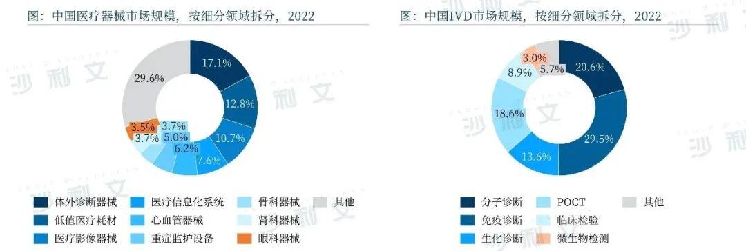 2022年中国医疗器械市场中,IVD行业的市场规模占据最大的份额,约为17.2%。其中,分子诊断是IVD行业的重要分支。与其它主要的体外诊断方法相比,分子诊断一方面可以从基因层面进行检测,因此在检测灵敏度和准确性上优势明显;另一方面,分子诊断在传染性疾病检测、肿瘤个体化诊疗等领域应用上具有独特的应用优势,可以实现生化检测和免疫诊断难以实现的检测能力,例如在感染初期识别病毒,或提早确认基因缺陷。其临床及科研应用市场巨大,因而在近年来获得迅速发展。2022年,从中国IVD市场规模按细分领域拆分的情况来看,分子诊断位于免疫诊断之后的第二大IVD细分赛道,占比超过五分之一。