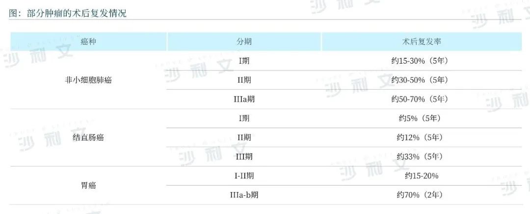 肿瘤复发是亟待解决的临床难题,以2022年中国癌症新发病例数前三的肺癌、胃癌和结直肠癌为例,癌症的复发率均较高。且处于早中晚各个阶段的癌症患者均需要定期检测。对于早中期患者,手术、同步放化疗等根治性治疗后,需要监测疾病复发和转移;对于中晚期患者,在采取化疗、靶向药以及免疫治疗后,需要及时评估疗效,监测耐药情况。