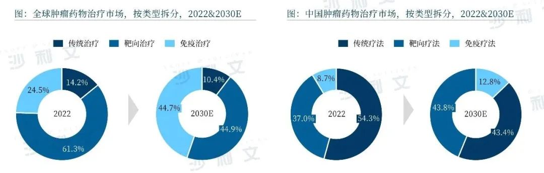 靶向治疗和免疫治疗可以避免化疗等传统治疗中的严重副作用,提高癌症治疗的效果。2022年,中国肿瘤市场的靶向治疗及免疫治疗的占比分别是37.0%和8.7%,明显低于全球靶向治疗及免疫治疗的比例。随着相关利好政策实施、更多靶向药物及免疫治疗药物获批上市,预计到2030年,中国靶向治疗及免疫治疗的市场占比将分别上升至43.8%及12.8%。