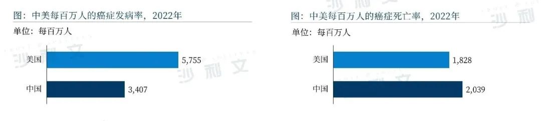 将中美癌症流行情况进行对比可发现,美国的癌症发病率远高于中国,2022年美国每百万人的癌症发病率达到了5,755,而中国为3,407。从死亡率来看,2022年美国每百万人的癌症死亡率达到了1,828,中国在这一数字上反超美国,达到2,039每百万人。