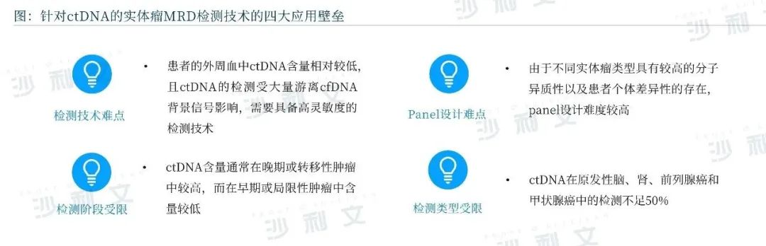ctDNA是实时评估MRD以及肿瘤复发风险的一种动态生物标志物,在实际的临床开发中,基于ctDNA的MRD检测面临的主要壁垒,包括检测技术不够灵敏、Panel设计难度高、检测阶段受限以及检测类型受限。
