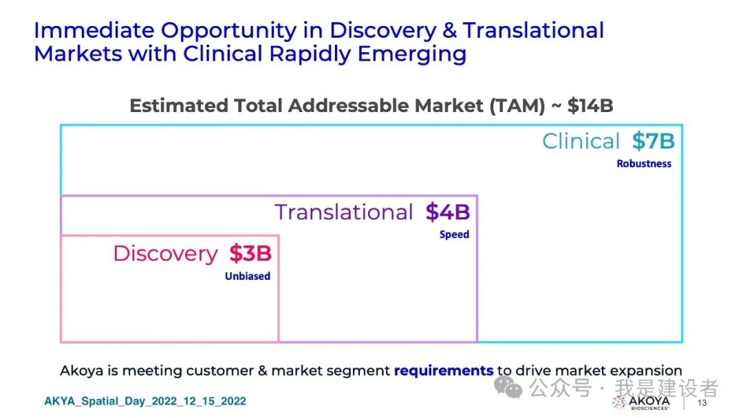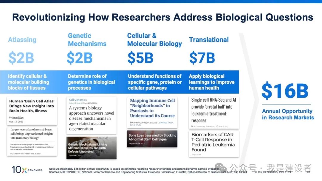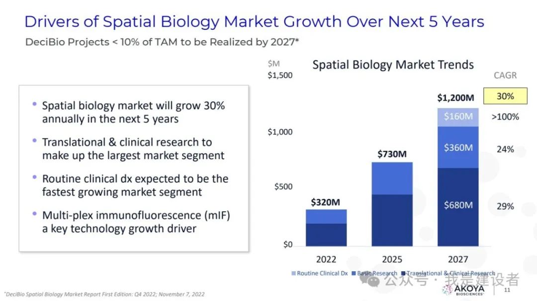 都说水大鱼大,容得下同饮一江水。为什么10x Genomics要对几家竞争者发起专利战,一副势不两立的样子。 如果一个市场足够大,应该容得下不同的玩家;似乎只有市场不太大,才会冰炭不同炉,起意敌对。 很好奇,空间生物学的市场到底有多大? 首先,什么是空间生物学? 空间生物学可以定义为在空间背景下对组织中的目标分析物进行的分析(即标记物在组织和/或其他位置的表达),并且主要由多重生物标志物的分析所驱动的生物学和病理生理学研究。当下,大多数空间分析都是蛋白质组学或转录组学或两者结合的多组学,空间基因组学(例如3D基因组)也存在,但不太常见。这些旨在原位分析多重生物标志物的技术,包括mIF、mIHC、数字空间分析、多重 FISH 和成像质量的流式细胞术等等。 再回到各家对于这一市场的预估和测算上。 10x三位一体的产品,定位在单细胞和空间组两个领域。两个领域代表了两个更深的维度,10x视传统的分子生物学、免疫荧光、细胞成像等技术工具可解决的市场均为潜在市场(TAM)。在研究和转化这个应用领域,10x认为存在160亿美元的TAM,其中转化的这个市场为70亿美元。10x称,每年大约160亿美元的机会是基于对研究人员资金和潜在制药样本可用性的估计。(这无异于在说,这个数字是夸大的带有水分的?) Nanostring则引用了LEK咨询公司2020年的一个报告(找不到具体出处),称GeoMx & CosMx所处的空间生物学研究的TAM为60亿美元(TAM约等于14,000套仪器=7000台GeoMx + 7000台CosMx),这其中包括了发现和转化。而基于空间的诊断市场可能超过60亿美元,所以整体空间生物学市场预期为120亿美元。 另一大玩家Bio-Techne的报告中简单提及空间生物学的TAM为50亿美元左右。 另一个数字则来自于Akoya,其在报告中称预期的TAM为140亿,包括了临床诊断的70亿美元市场。然后又引用DeciBio的报告(第一版,Q4 2022)称只有TAM的10%能在2027年之前实现。DeciBio的报告里写到,以每年30%的增长,到2027年空间生物学的市场为12亿美元,其中一半以上为转化及临床研究。 DeciBio将与购买用于运行检测的空间生物学平台或试剂/套件相关的仪器和试剂收入,以及与空间载片或图像分析的湿实验室处理相关的服务收入(例如,由CRO/参考实验室),及向学术界、生物技术/制药公司和 CRO 客户(包括治疗公司和诊断/分析工具公司)销售产品和服务的收入包含在了报告内,但不包括数字病理学/图像分析,与 CDx开发服务收入,及其他无需空间分析的组织学测试等项目。 DeciBio也在最近升级了这个报告的第二版,空间生物学市场预计在 2024 年将达到约 8.6 亿美元,并预计在未来 5 年内每年增长 21%,到 2029 年将达到约22.7亿美元。 从这些差异巨大的市场容量测算来看,空间生物学领域还很年轻,这些预测存在很大的不确定性,任何可能出现的关键发展都能决定该技术的未来采用及速度。 举例来看,10x称原位空间分析平台Xenium仅发布一年就累计售出250多台,实现了快速的采用和开机运行。这什么概念?作为对比,CosMx作为Xenium的对头产品,是NanoString三个平台中采用最快的,发布5个季度累计订单180台。 迄今为止,学术界一直是空间生物学分析的最大客户群体,然而,随着初步研究产生有希望的结果以及技术和分析管道变得更容易获得和验证,空间生物学在生物制药转化研究和临床试验中的使用正在增加。可扩展性、标准化和临床实用性的持续进步预计将推动研发各个阶段的增长。 过去三年,10x的空间产品(包括Visium和Xenium)实现了快速增长,截止去年底,其空间产品的仪器累计销售786台,仪器及耗材总营收约为1.35亿美元。与之相类似,NanoString的空间产品(包括GeoMx和CosMx)也保持了积极的增长,截止2023年第3季度(此后身陷禁令泥潭,至今未提交第四季度及年报),实现安装510套,在此之前的12个月实现了总营收8400万美元。从运营及财务结果来看,两者真是势均力敌。 不管是按照8.6亿美元还是各自估算的超100亿的市场规模,10x在空间生物学的市场渗透率都还远不及20%。DeciBio的报告称该市场已适度整合,包括 10x、NanoString、Akoya Biosciences 和 Bio-Techne 在内的头部供应商占据了约 60% 的市场份额。然而,其他几个中小型企业(例如Standard BioTools、徕卡显微系统公司、Ultivue 和 Vizgen等)随着市场的增长和进一步发展,已准备好抢占市场份额。 这可能部分解释了为什么10x对几个竞争对手挑起了专利纠纷。 未来的空间组学市场可能有很大,但眼前的这个市场可能真得拼命才能胜出。而专利正是一把威力无穷且精准致命的武器。 |