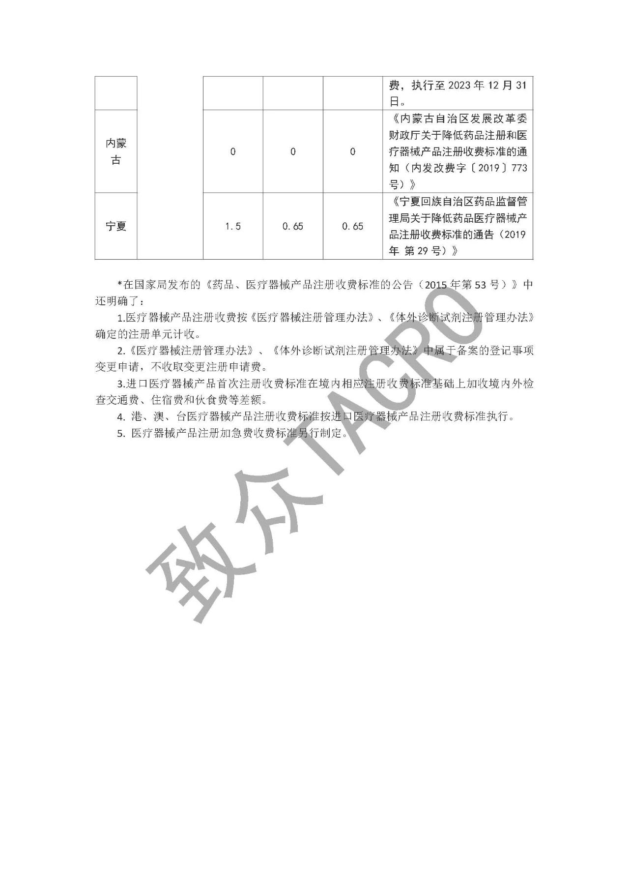注:1.医疗器械产品注册收费按《医疗器械注册与备案管理办法》、《体外诊断试剂注册与备案管理办法》确定的注册单元计收。 2.《医疗器械注册与备案管理办法》、《体外诊断试剂注册与备案管理办法》中属于变更备案申请的,不收取变更注册费。 3.以受理通知书上落款日期为准,受理通知书上落款日期标注为2024年4月1日(含4月1日)以后,按调整后标准收费。 附件2 上海市药品、医疗器械产品注册收费实施细则 依据《医疗器械监督管理条例》《药品注册管理办法》《医疗器械注册与备案管理办法》《体外诊断试剂注册与备案管理办法》《关于本市药品及医疗器械产品注册收费管理的通知》等有关规定,制定本实施细则。 一、注册费缴费程序 注册申请人向上海市药品监督管理部门提出申请,上海市药品监督管理部门受理后按财政部门非税收入管理规定出具《行政许可项目缴费通知书》或系统生成《电子缴款书》,注册申请人通过银行直接缴款入国库。 二、注册费缴费说明 1.药品再注册申请人在申报系统中生成《电子缴款书》后按照要求缴纳注册费,上海市药品监督管理部门通过上海市药品监管行政审批系统掌握注册申请人缴纳情况,未按要求缴纳的,其注册程序自行中止。 2.按医疗器械管理的体外诊断试剂的注册收费适用本实施细则。 3.《医疗器械注册与备案管理办法》《体外诊断试剂注册与备案管理办法》中属于变更备案申请的,不收取变更注册费。 4.医疗器械注册申请人应当在收到《行政许可项目缴费通知书》后15个工作日内按照要求缴纳注册费,上海市药品监督管理部门通过非税收入管理平台掌握注册申请人缴纳情况,未按要求缴纳的,其注册程序自行终止。 5.注册申请受理后,申请人主动提出撤回注册申请的,或上海市药品监督管理部门依法做出不予许可决定的,已缴纳的注册费不予退回。再次提出注册申请的,应当重新缴纳费用。 三、小微企业优惠政策 对符合《中小企业划型标准规定》(工信部联企业〔2011〕300号)条件的小微企业注册申请人提出的创新医疗器械产品首次注册申请,免收其注册费。创新医疗器械产品是指根据《上海市第二类创新医疗器械特别审查程序》同意纳入第二类创新医疗器械的产品。 四、其他问题说明 对于符合退费条件的,由申请人向受理部门提交退费申请、汇款凭据、《非税收入一般缴款书》等有关材料,于每年4月底或10月底前按规定办理退费手续。 |