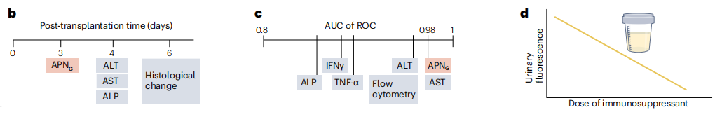 移植排斥反应是由大量过度反应的T细胞引起的。“T型细胞”是排斥反应的主要介质,其标志物为颗粒酶B。颗粒酶B的可激活多荧光团纳米传感器(APNG)可在小鼠移植肝脏中积累,其中高水平的T细胞和颗粒酶B解聚APNG,释放AUB。该探针最早可以在移植后3天报告排斥反应(图b,c)。此外,APNG还可以测量免疫相关蛋白酶,从而可以长期监测免疫治疗的疗效(图d)。除此之外,颗粒酶B还可以作为筛选免疫治疗药物及其最佳剂量的指标。