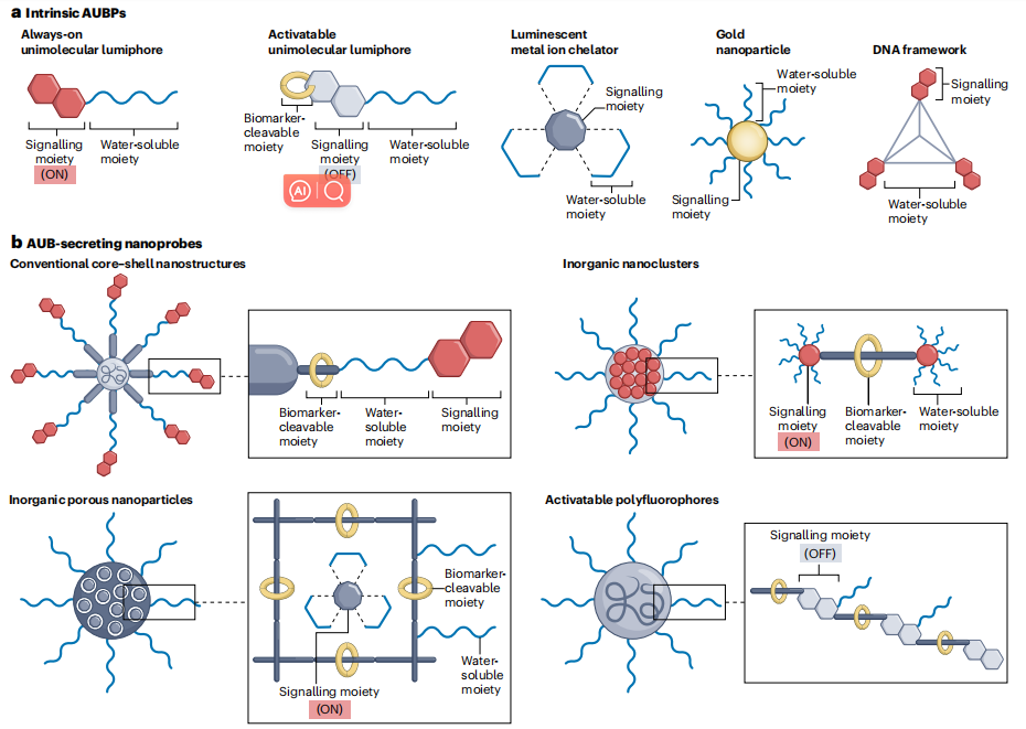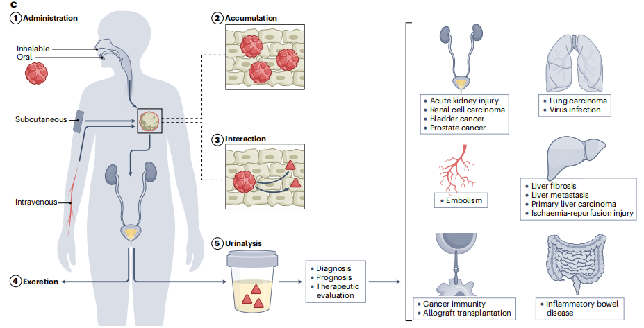 在现代临床实践中,尿检被认为是最常见、最简单、最微创的筛查检查。尽管在代谢性和泌尿系统疾病方面取得了显著的成就,但由于尿液中内源性生物标志物的浓度低、疾病特异性差,尿液分析在诊断方面存在局限性。为了便于尿液分析,人工尿液生物标志物探针(AUBPs)的新型诊断药物已经被开发出来。AUBP是一种小分子或纳米大小的成像探针,旨在通过在体内与疾病相关的内源性生物标志物相互作用,释放人工尿液生物标志物(AUBs)(图c)。到目前为止,AUBP已在各种动物模型中被验证用于诊断、预后和治疗应用,具有良好的临床转化前景。