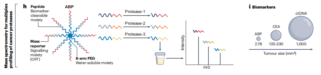 多重检测肿瘤蛋白酶可提高特异性;例如,一种AUBP包含多种蛋白酶底物(图h),与癌症相关蛋白酶反应,会释放裂解片段作为AUB,且AUC随着蛋白酶类型的增加而增加。这种多重AUBP可以区分由Kras或Trp53突变或Eml4-Alk融合驱动的癌症,并可识别出超小肿瘤,优于临床生物标志物(图i)。