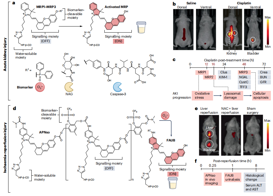 缺血-再灌注损伤(IRI)。 ROS引起的氧化应激是IRI损伤的一个标志,APNSO纳米探针是一种响应超氧阴离子的可激活荧光团,可以通过体内成像和尿液分析分别检测到再灌注后15 min和1小时的肝脏IRI(图f)。