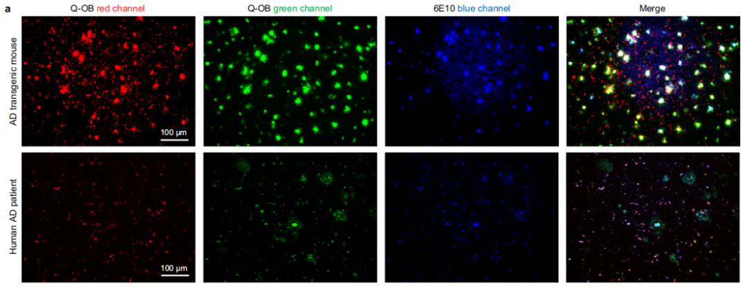 作者通过脑组织成像实验深入研究了Q-OB对Aβ聚集体的检测能力。用Q-OB和抗Aβ抗体6E10对脑组织进行共染色,发现明显的Aβ积累,且阳性染色表现出明显的共定位(图a)。这些结果表明Q-OB染料并不局限于检测转基因AD小鼠大脑中的Aβ寡聚体。Q-OB同样能染色人脑组织中的Aβ聚集体,且标记并不局限于Aβ寡聚体,而且纤维沉积物也可以被染色。