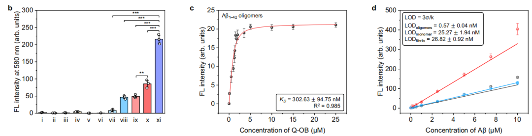 Q-OB对Aβ寡聚体的识别有相对优势。Aβ1-42寡聚体相比Aβ1-40和Aβ1-42单体、Aβ1-40和Aβ1-42原纤维,荧光有显著增强,这表明Q-OB与Aβ1-42寡聚体的相互作用比其他寡聚体更有效地实现了显著的荧光发射(图b)。通过测定各Aβ1-42物种Q-OB的检测限,寡聚体、单体和纤维聚集体的检测限分别为0.57, 25.27和26.82nM(图d)。此外,在各实验条件下,Q-OB的荧光强度只随Aβ1-42寡聚物发生变化,完全独立于潜在的干扰物比如p-Tau、白蛋白等。