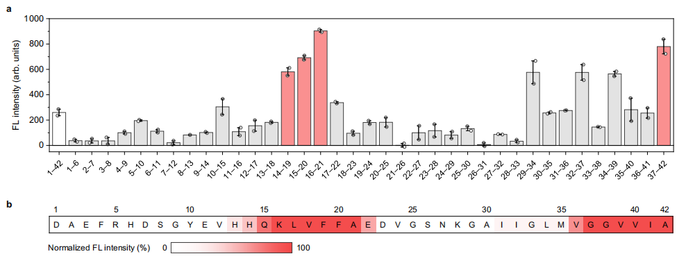 Q-OB主要与Aβ1-42中心疏水区(14-21)和C端(29-42)相互作用,这两个区域在聚集过程中起重要作用(图a)。Q-OB对Aβ寡聚体的偏爱是由于在Aβ寡聚体组装成成熟原纤维之前,其表面短暂出现了暴露的疏水区域。这些结果表明Q-OB主要与大于100 kDa的Aβ1-42寡聚物相互作用,表明其组装超过了二十二聚体。