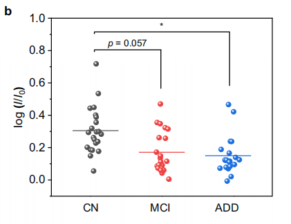 采用Q-OB对CN(非痴呆对照组)、MCI(轻度认知障碍)和ADD(阿尔茨海默病痴呆)脑脊液样品进行共孵育荧光动力学分析。结果表明,通过使用CSF无法区分MCI和ADD,而CN与其他两种病理状态(MCI和ADD)之间存在显著差异(图b),这表明此方法可以在临床应用中诊断CN到MCI的病理进展。且Q-OB检测显示与AD患者CSF标志物Aβ1-42, p-Tau181和t-Tau的诊断有显著相关性。
