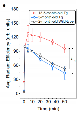 为了探索Q-OB在体内光学成像应用的可行性,将Q-OB静脉注射到小鼠体内后,Q-OB可以有效地定位到大脑中,这表明Q-OB可以用作潜在的脑生物标志物显像剂。使用体内成像系统(IVIS)进行图像采集,以可视化体内Aβ沉积。结果显示野生型以及不同月龄的AD小鼠显示出显著不同的荧光强度(图e)。