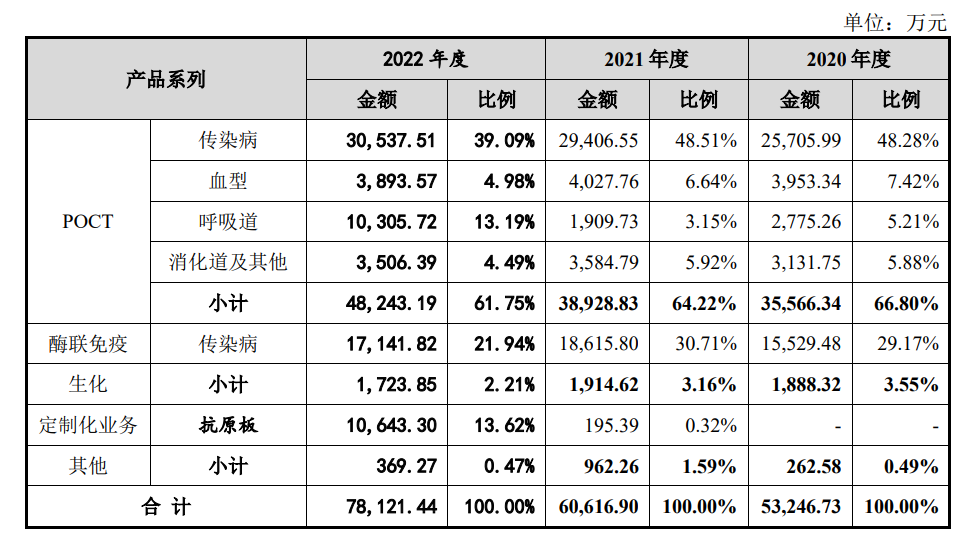 财务方面,2020年、2021年及2022年,英科新创的营业收入分别为5.32亿元、6.06亿元和7.81亿元,扣除非经常性损益后归属于公司普通股股东的净利润为1.08亿元、1.12亿元和1.68亿元,其中,POCT和酶联免疫系列产品合计占主营业务收入的比例分别为95.97%、94.93%和83.70%,为公司营业收入的主要来源。