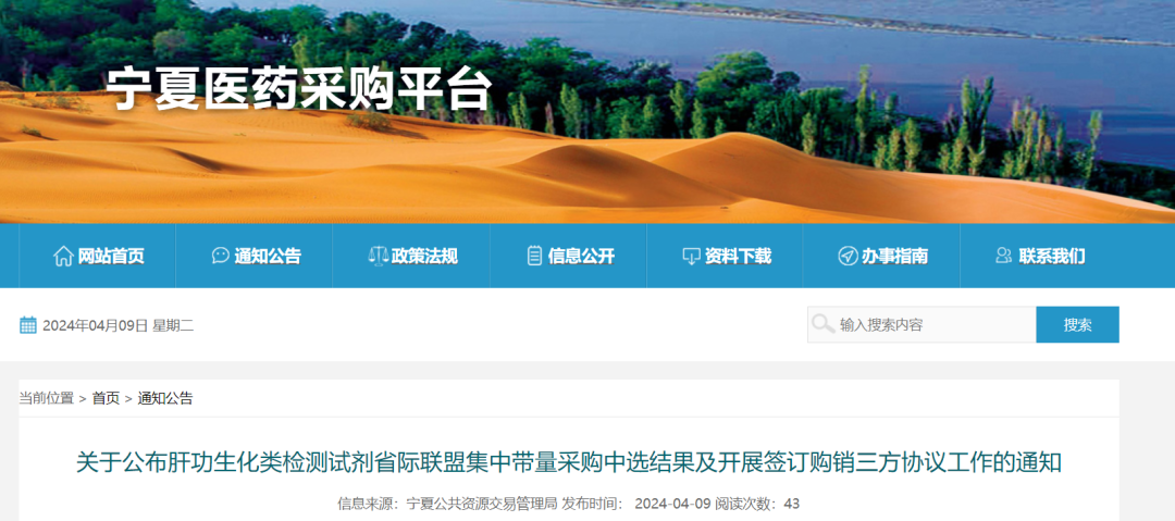 根据《自治区医保局关于执行肝功生化类检测试剂省际联盟带量采购中选结果的通知》(宁医保办发〔2024〕24号)要求,现将肝功生化类检测试剂省际联盟集中带量采购中选结果予以公布(详见附件1)。同时开展中选产品签订购销三方协议相关工作。现将具体事项通知如下:(一)肝功生化类检测试剂省际联盟集中带量采购全区已填报需求量的公立医疗机构(详见附件2)。(二)肝功生化类检测试剂省际联盟集中带量采购中选生产企业。(三)肝功生化类检测试剂省际联盟集中带量采购中选生产企业选定的配送企业。各相关医疗机构、生产企业、配送企业签订购销三方协议时间:2024年4月9日至17日。请生产企业使用CA数字证书,登录宁夏医药采购平台,进入“检验试剂子系统——试剂交易”,在“配送协议管理”页面自主选择配送企业并予以添加产品。具体操作详见宁夏医药采购平台右上角“帮助文档”页面的“试剂交易操作手册——宁夏医药采购平台试剂交易——生产企业”。请配送企业使用CA数字证书,登录宁夏医药采购平台,进入“检验试剂子系统——试剂交易”,在“配送协议管理”页面完成生产企业委托配送关系的确认工作。具体操作详见宁夏医药采购平台右上角“帮助文档”页面的“试剂交易操作手册——宁夏医药采购平台试剂交易——配送企业”。各相关医疗机构、生产企业、配送企业须在系统右上角的帮助文档,仔细阅读各自的操作手册,网上签订购销三方协议。(一)各相关医疗机构、生产企业、配送企业登录系统前务必安装CA数字证书驱动,此步骤是在线签订购销三方协议时的必要条件。(二)医疗机构(甲方)、生产企业(乙方)、配送企业(丙方)均使用CA锁登录系统,在线签订中选产品购销三方协议。协议签订分为四步,第一步由生产企业选择配送企业并进行协议签订;第二步由配送企业响应签订协议;第三步由生产企业在协议下添加产品;第四步由医疗机构基于约定采购产品设置配送企业后,系统自动生成生产企业、配送企业签订且医疗机构待签的协议,医疗机构签订后协议生效。(三)医疗机构待生产企业和配送企业购销三方协议签订完成后,方可完成上述第四步操作。(四)购销三方协议签订完成后,医疗机构即可在试剂交易系统实施采购交易。