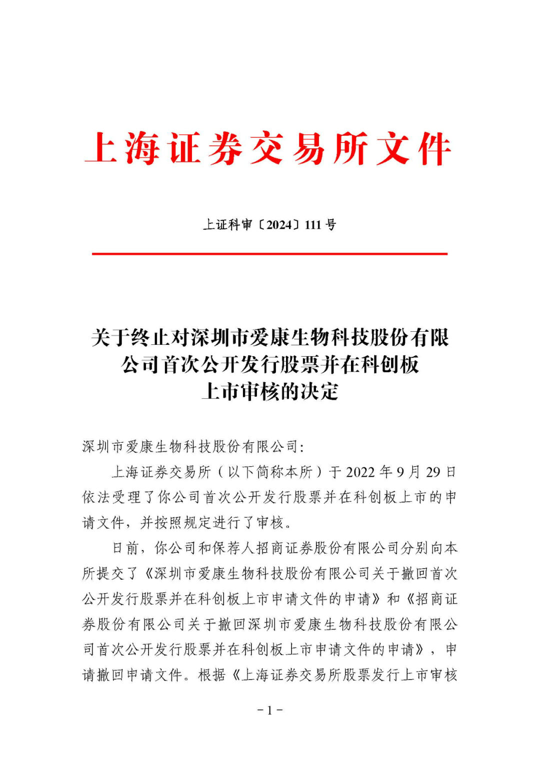 4月9日,上交所官网显示,深圳市爱康生物科技股份有限公司科创板IPO已终止。