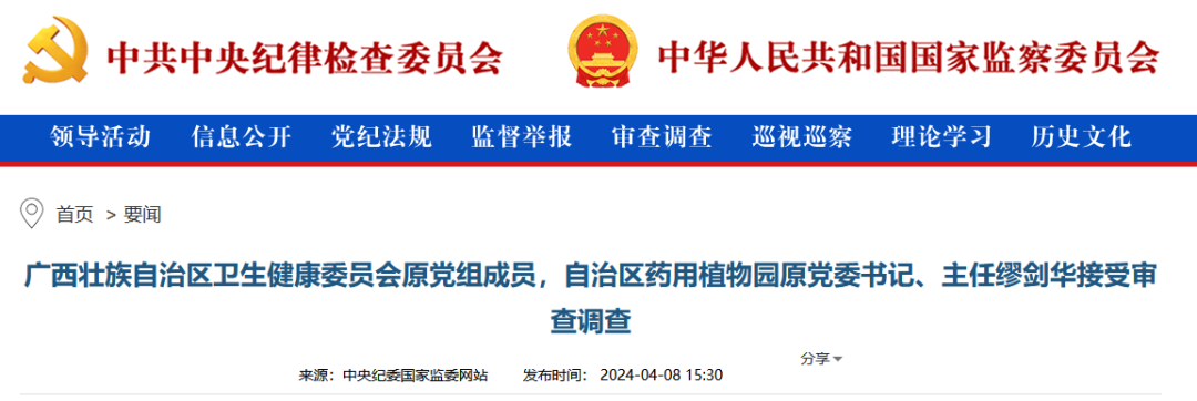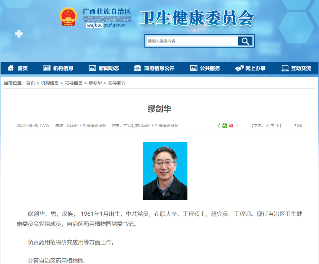 4月8日,中央纪委国家监委网站发布通报:广西壮族自治区卫生健康委员会原党组成员,自治区药用植物园原党委书记、主任缪剑华接受审查调查。 公开资料显示,缪剑华,男,1961年1月生,江苏海安人,中共党员,博士,二级研究员,博士生导师,国务院政府特殊津贴专家,国家卫生计生委突出贡献中青年专家,全国模范军队转业干部、国家中药现代化科技产业基地建设十周年先进个人、科学中国人2017年度人物、广西B类高层次人才;全国专业技术人才先进集体、全国卫生计生系统先进集体领军人。2000年,缪剑华从部队转业后,被安排到当时的北海市体委当副主任;2001年起,缪剑华先后担任中国医学科学院药用植物研究所广西分所所长、广西壮族自治区药用植物研究所所长、广西壮族自治区药用植物园主任,广西中药材良种繁育人才小高地领军人才和学术带头人、广西药用植物研究所博士后科研工作站学术委员会主任,广西中药材产业协会会长、广西民族医药协会理事会副会长和广西卫生产业企业管理协会副会长。此后,缪剑华担任广西壮族自治区卫生健康委员会党组成员,自治区药用植物园党委书记、主任,兼任中国药学会中药资源专业委员会主任委员、第四次全国中药资源普查技术指导专家组副组长、广西科研院所协会第八届理事会会长,《中国现代中药》及《广西科学》编委等职。缪剑华长期从事药用植物园建设理论与药用植物保育研究,完善了药用植物保育理论与技术体系,创建了“药用植物保育学”新学科,出版《药用植物保育学》专著并列入国家“十三五”重点教材,还有其他多项成就。在此期间,他获得国家级、省部级科学技术进步奖等5项,发表论文120余篇,主编著作5部,参编16部;制定中药材地方标准40项,获国家发明专利63项,登记药用植物新品种10个。目前,广西卫健委官网领导信息一栏依然可以检索出缪剑华的个人简介。